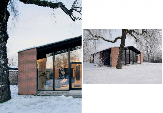 The material palette is a refined mix of the “raw and the cooked.” Polished concrete floors provide a cool, industrial base, while built-in furniture made of local oak adds a layer of domestic warmth. This juxtaposition pays homage to the site’s history—referencing the utilitarian materials of the post-war era—while elevating them through contemporary detailing. Every surface is designed to catch the shifting patterns of light filtered through the poplar leaves, ensuring that the atmosphere of the house changes constantly throughout the day and the seasons.Exterior view of Slovenian home extension