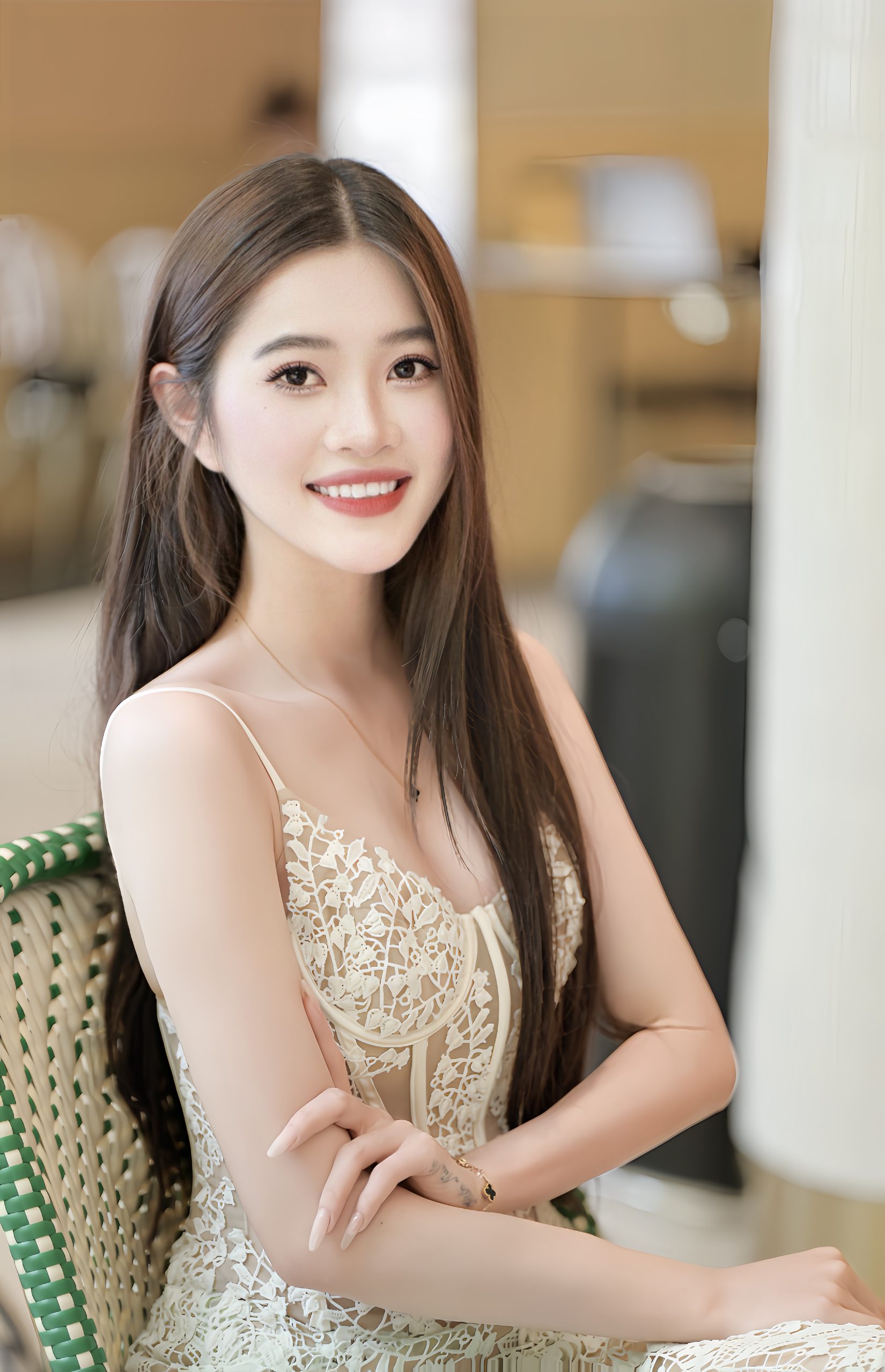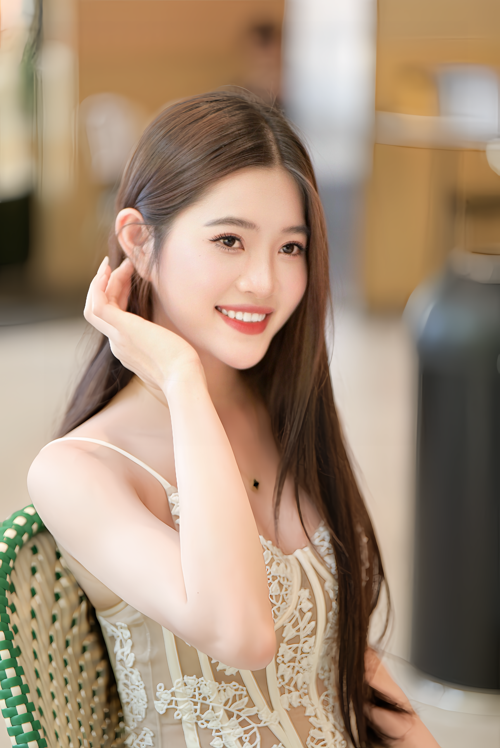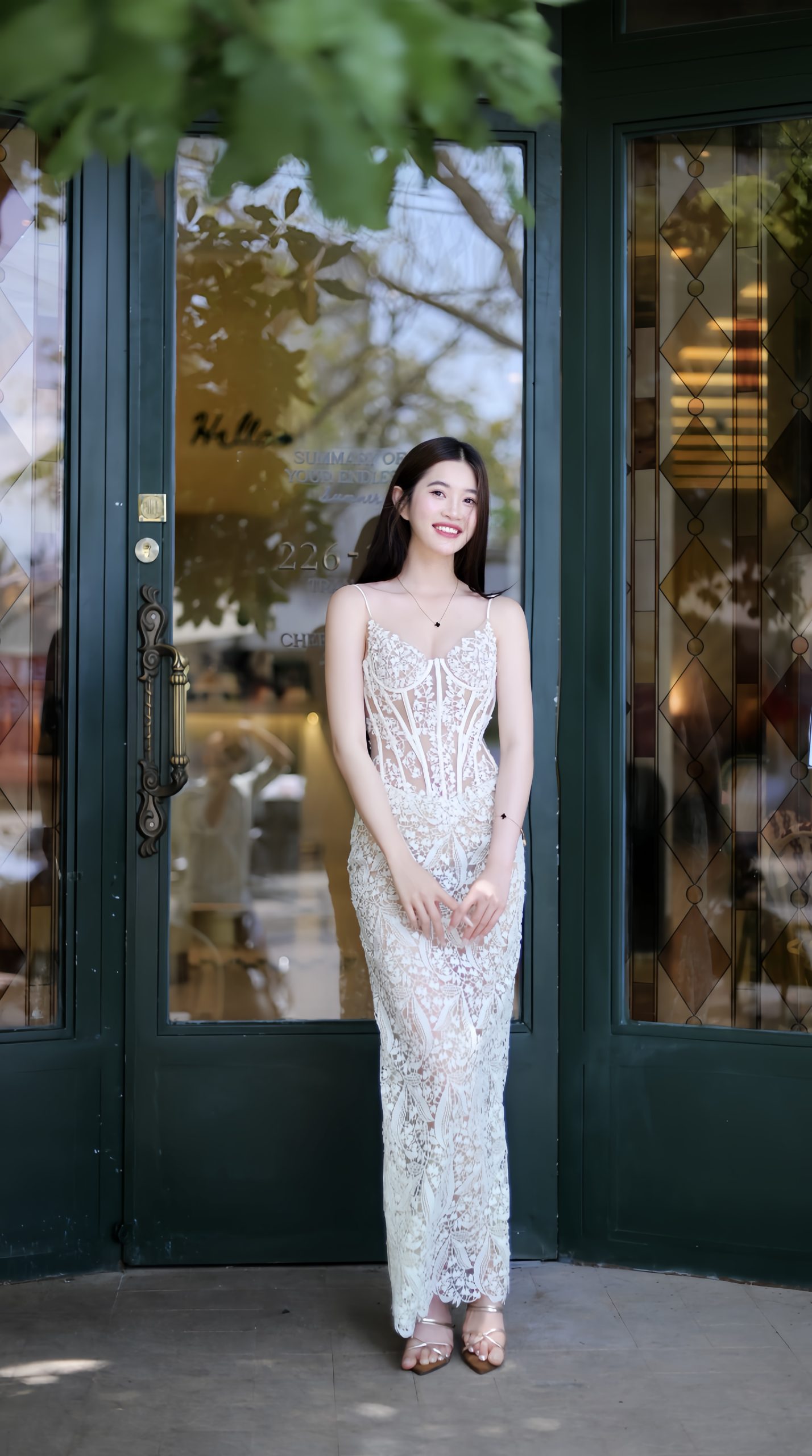 Nụ cười rạng rỡ cùng mái tóc suôn mượt buông nhẹ sau lưng khiến cô trở thành điểm nhấn đầy nổi bật giữa không gian cổ kính của cánh cửa gỗ kính phía sau. Không chỉ là một trang phục đẹp, mà cả thần thái, sự tự tin và phong cách mà cô mang theo đã tạo nên một tổng thể hoàn hảo, một nàng thơ hiện đại, thanh thoát nhưng vẫn đậm chất quyến rũ. Cô gái trong bức ảnh không chỉ đơn thuần là một người mẫu, mà là hiện thân sống động của sự duyên dáng và tinh thần thời trang đương đại.
