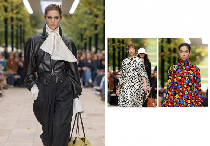 Scarves were tied around necklines, tucked into jackets, used as lining for trench coats, and affixed to slimline clutch bags. Beyond the scarf motif, the collection embraced playful patterns, including micro-pop-art florals reminiscent of the 1960s and more elaborate scarf-print jersey tops. These prints, often applied to youthful A-line mini dresses, injected light optimism and joy into a collection that otherwise leaned on a sophisticated black, navy, and camel palette.