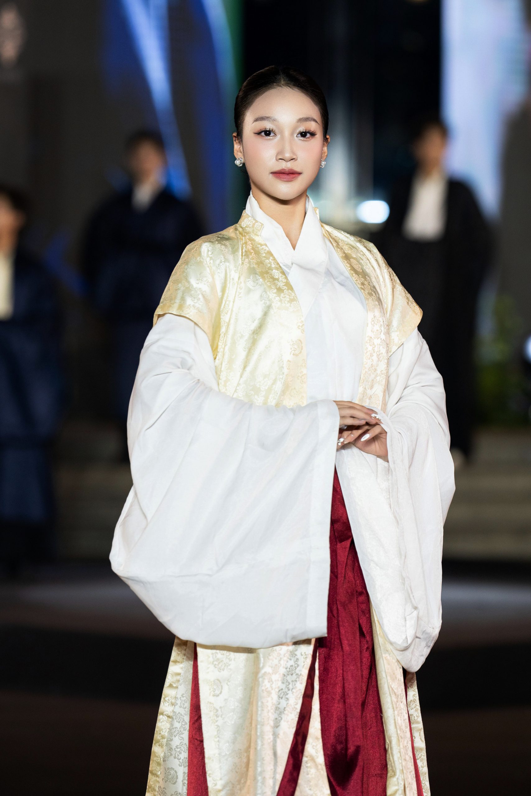 Sự lựa chọn chất liệu gấm, lụa kết hợp cùng các chi tiết thêu tay, kỹ thuật may truyền thống được giữ vẹn trong từng đường may, nếp gấp, đường viền gấu váy, phần cổ, tay áo. Khi Thiên An bước đi, tà áo bay nhẹ, phần váy lay động theo từng nhịp chân, ánh vàng của áo choàng phản chiếu ánh đèn, hòa cùng ánh nhìn dịu dàng, tự tin, tạo nên một khoảnh khắc nghệ thuật hoàn chỉnh.