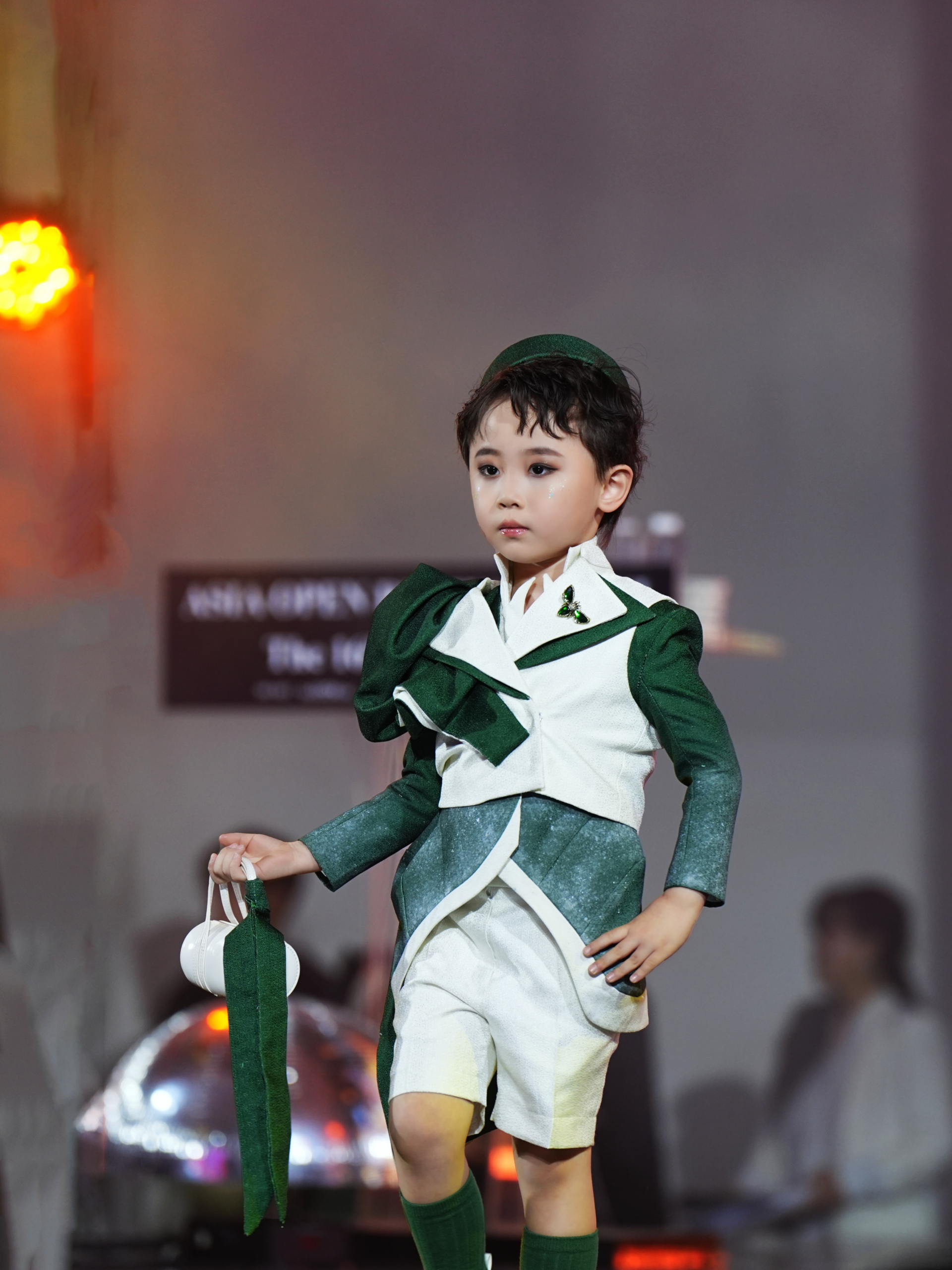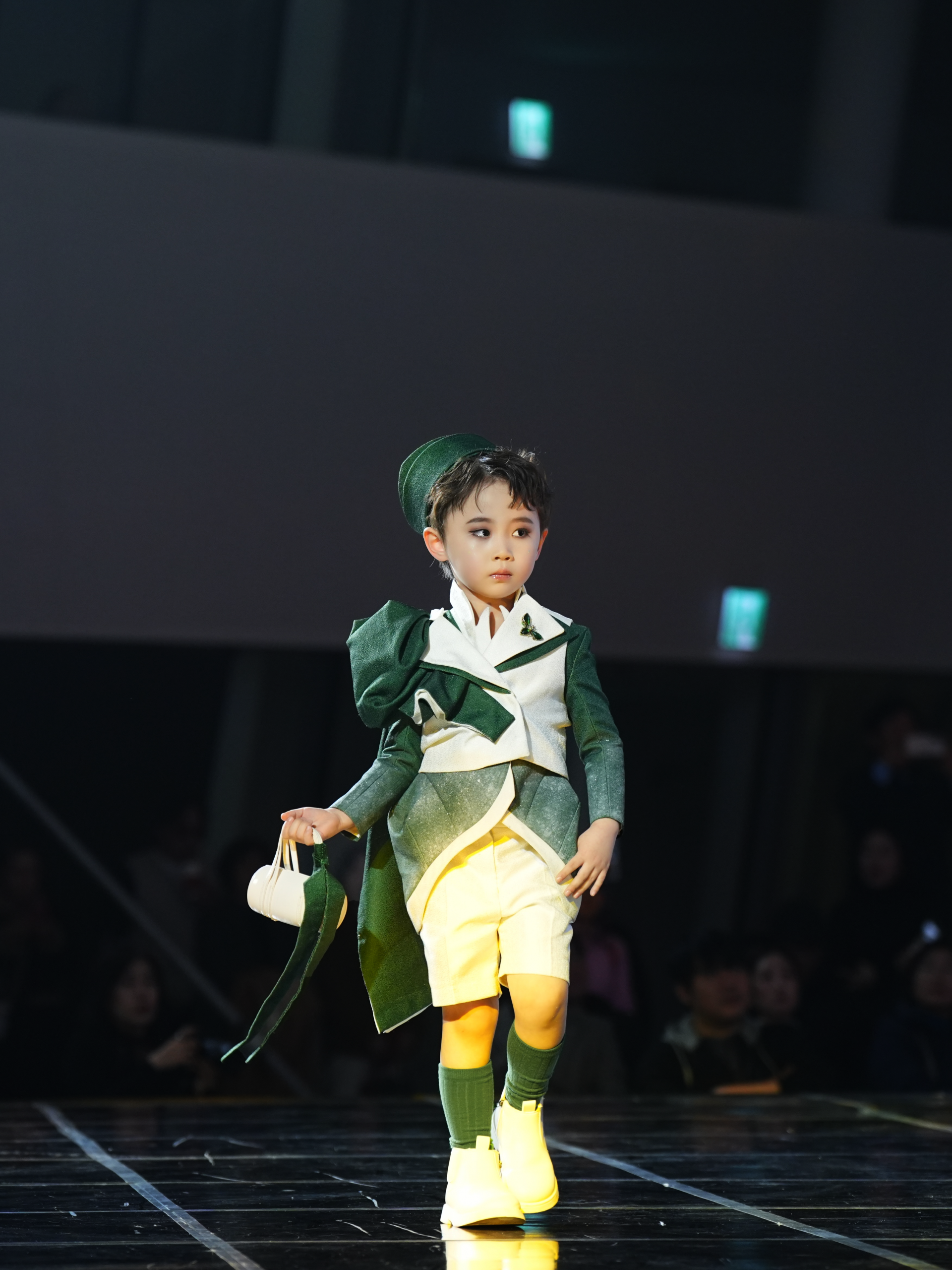 Điểm nhấn đáng chú ý nhất trong màn trình diễn của Ji Eun Yul chính là việc kết hợp đạo cụ một cách khéo léo. Cậu bé xuất hiện với một chiếc túi xách trắng nhỏ gọn, cầm tay một cách tự nhiên như một phần của ngôn ngữ cơ thể. Cách Eun Yul xử lý đạo cụ trên sàn runway cho thấy quá trình rèn luyện bài bản, giúp cậu bé giữ được sự cân bằng và phong thái chuyên nghiệp dù di chuyển trong môi trường sân khấu ánh sáng phức tạp.