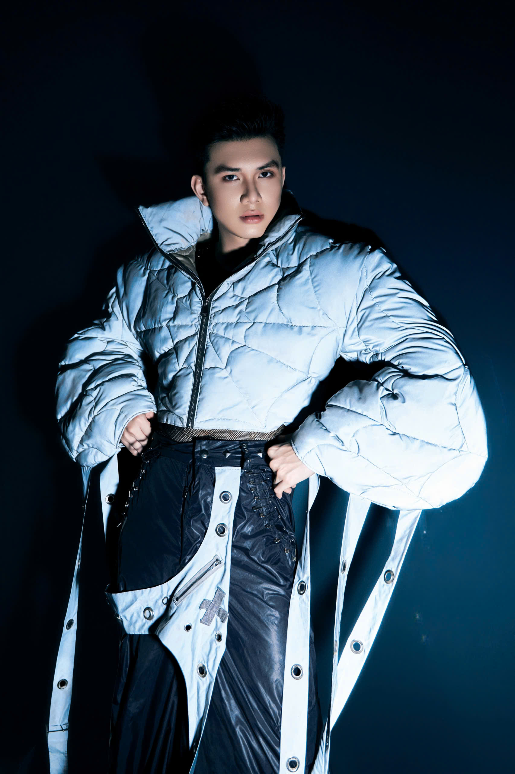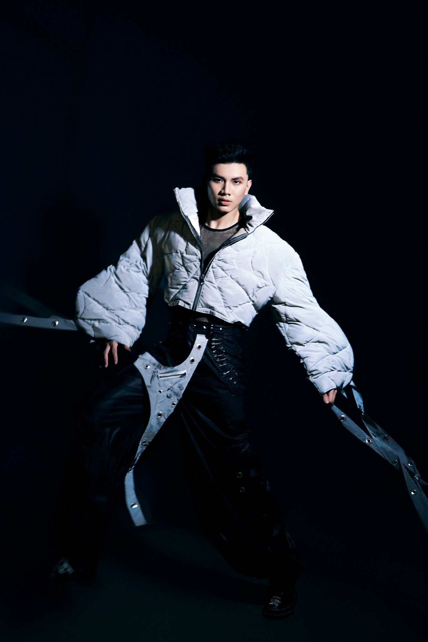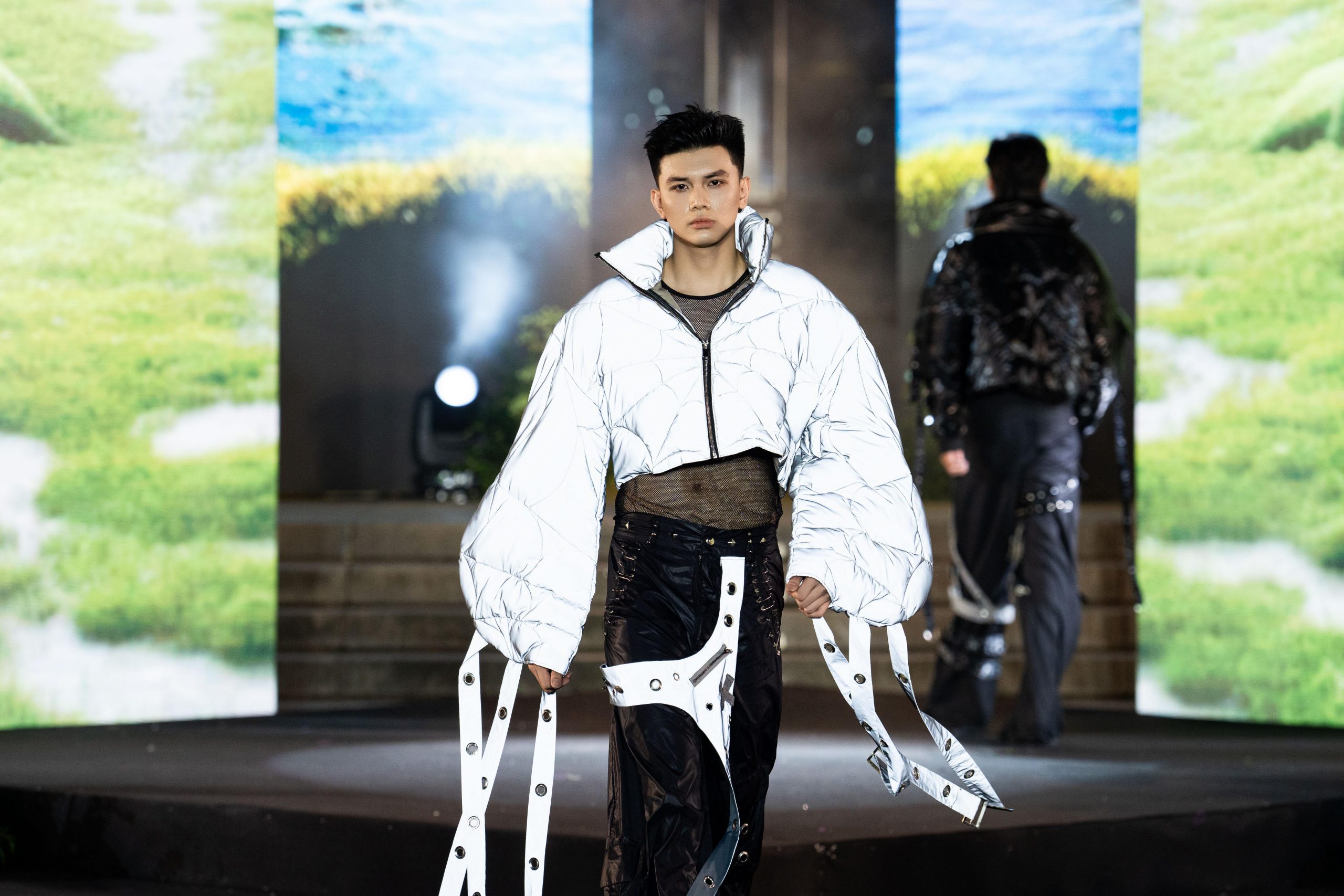 Chất liệu lưới ánh kim mặc bên trong vừa gợi cảm vừa gợi mở tinh thần phóng khoáng, khéo léo tôn lên hình thể săn chắc của người mẫu, đồng thời tạo điểm nhấn layer thú vị khi kết hợp cùng áo phao chần bông. Bộ quần rộng dáng streetwear kết hợp kỹ thuật cắt cúp hiện đại giúp từng bước catwalk của Tùng Vũ trở nên phóng khoáng, toát lên tinh thần tự do và năng lượng tuổi trẻ.