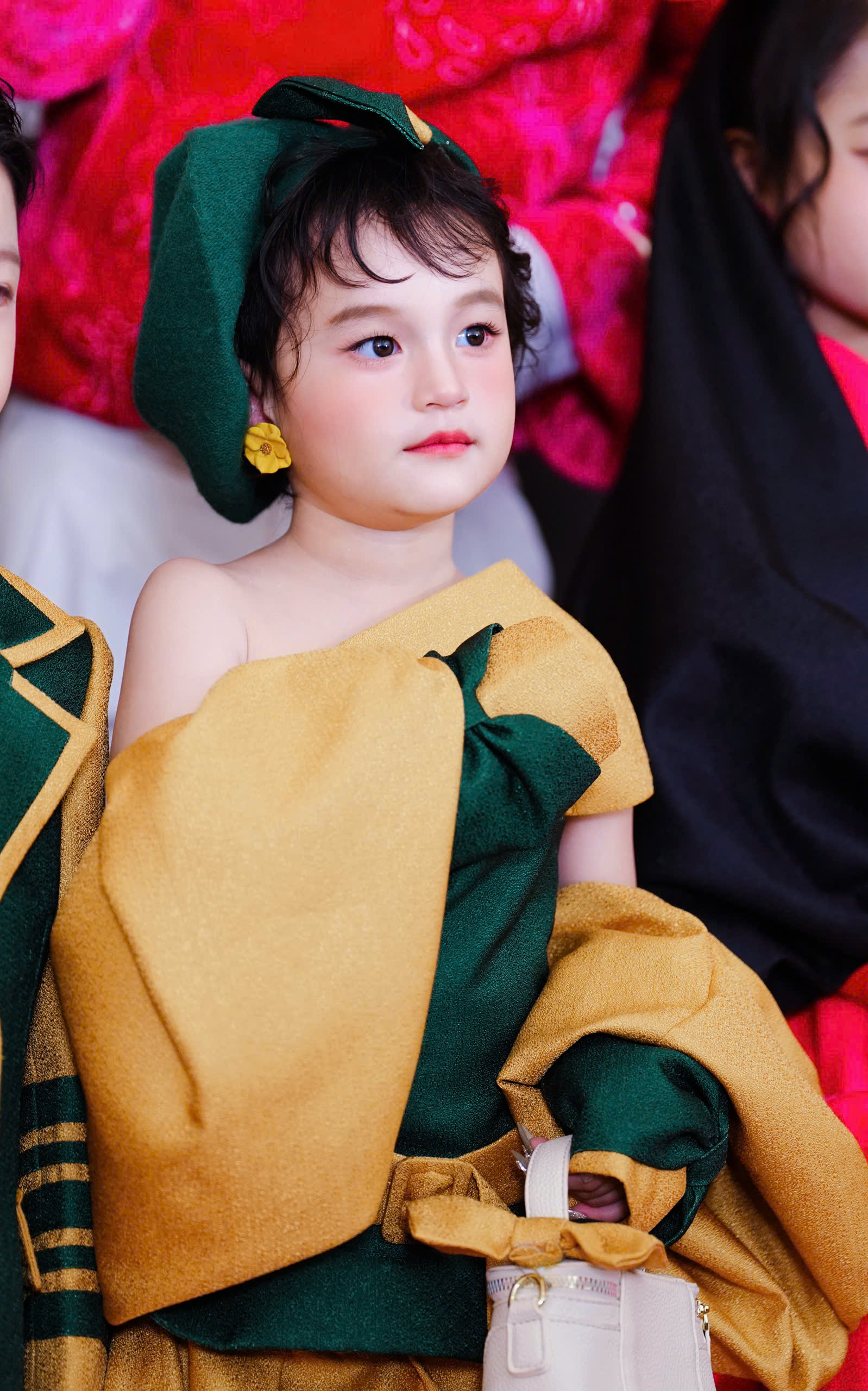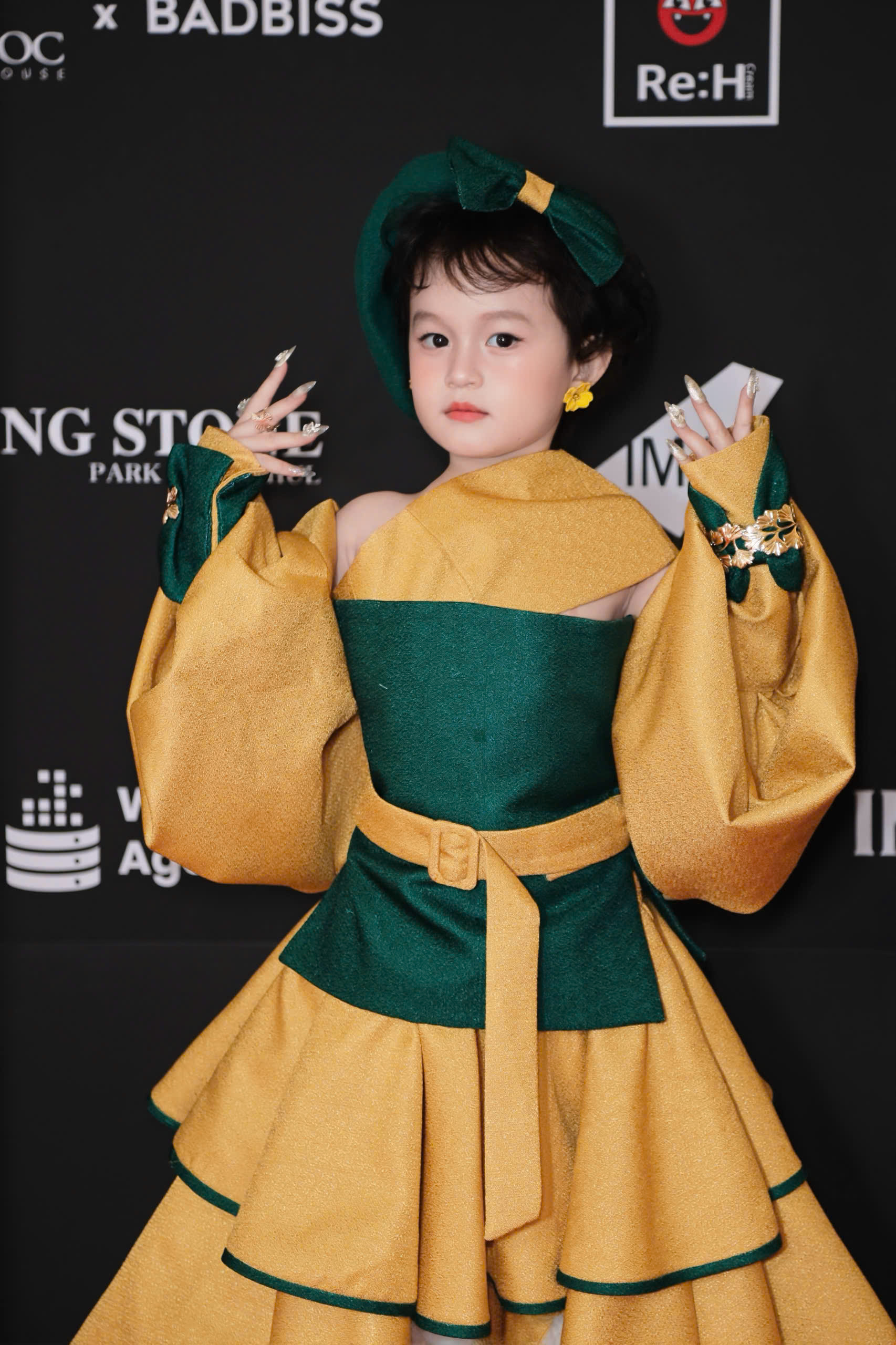 Điểm nhấn của bộ trang phục nằm ở cấu trúc tầng váy xếp lớp cầu kỳ, tạo độ phồng và sự uyển chuyển trong mỗi bước đi. Chất liệu vải có độ bóng nhẹ giúp bắt sáng hiệu quả dưới ánh đèn sân khấu, khiến mẫu nhí trở nên nổi bật giữa không gian rộng lớn của DDP. Những chi tiết như thắt lưng to bản hay chiếc mũ beret cách điệu cùng tông xanh đã hoàn thiện vẻ ngoài sang trọng, vừa mang nét cổ điển Âu châu vừa giữ được sự hồn nhiên, trong sáng của lứa tuổi mầm non.