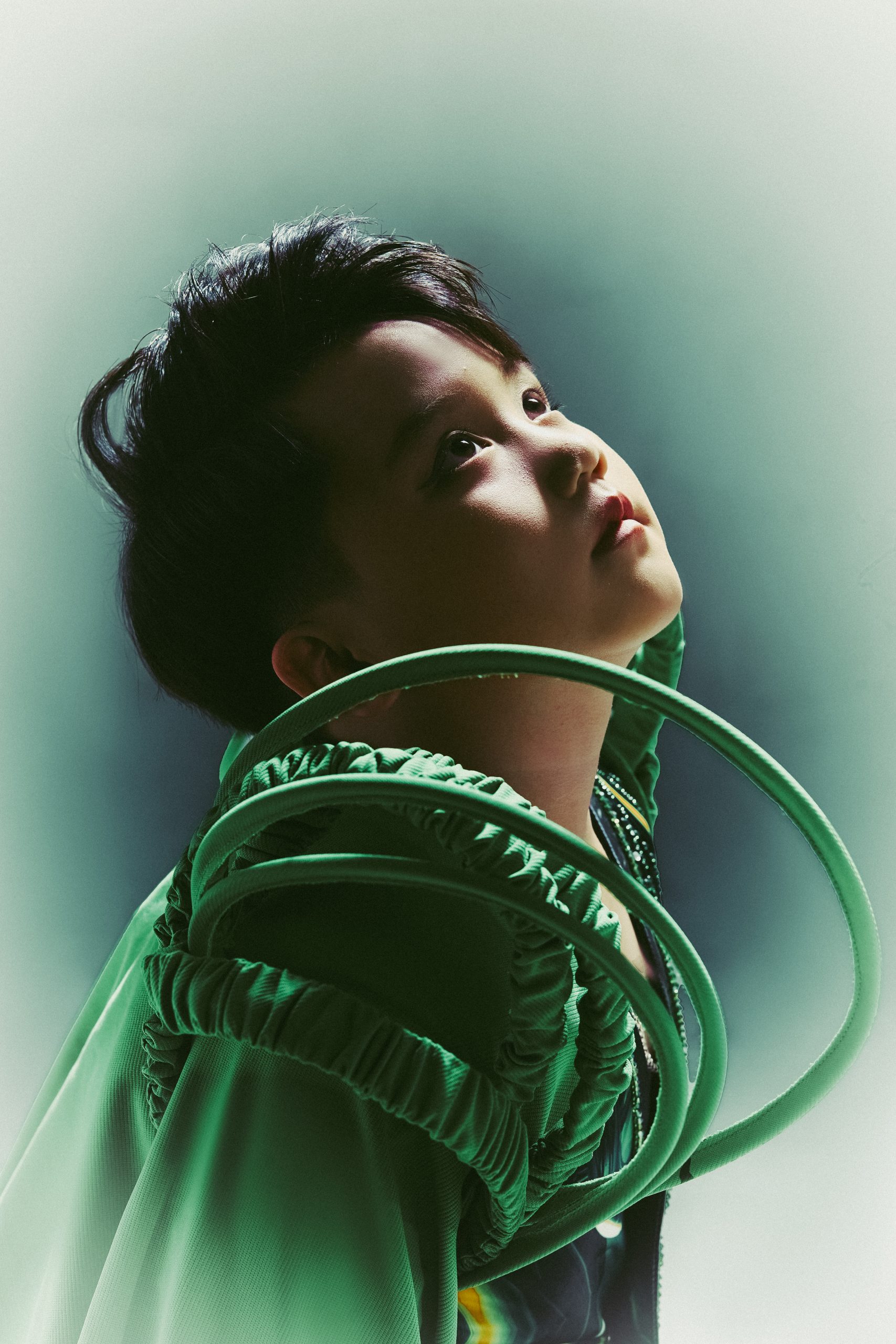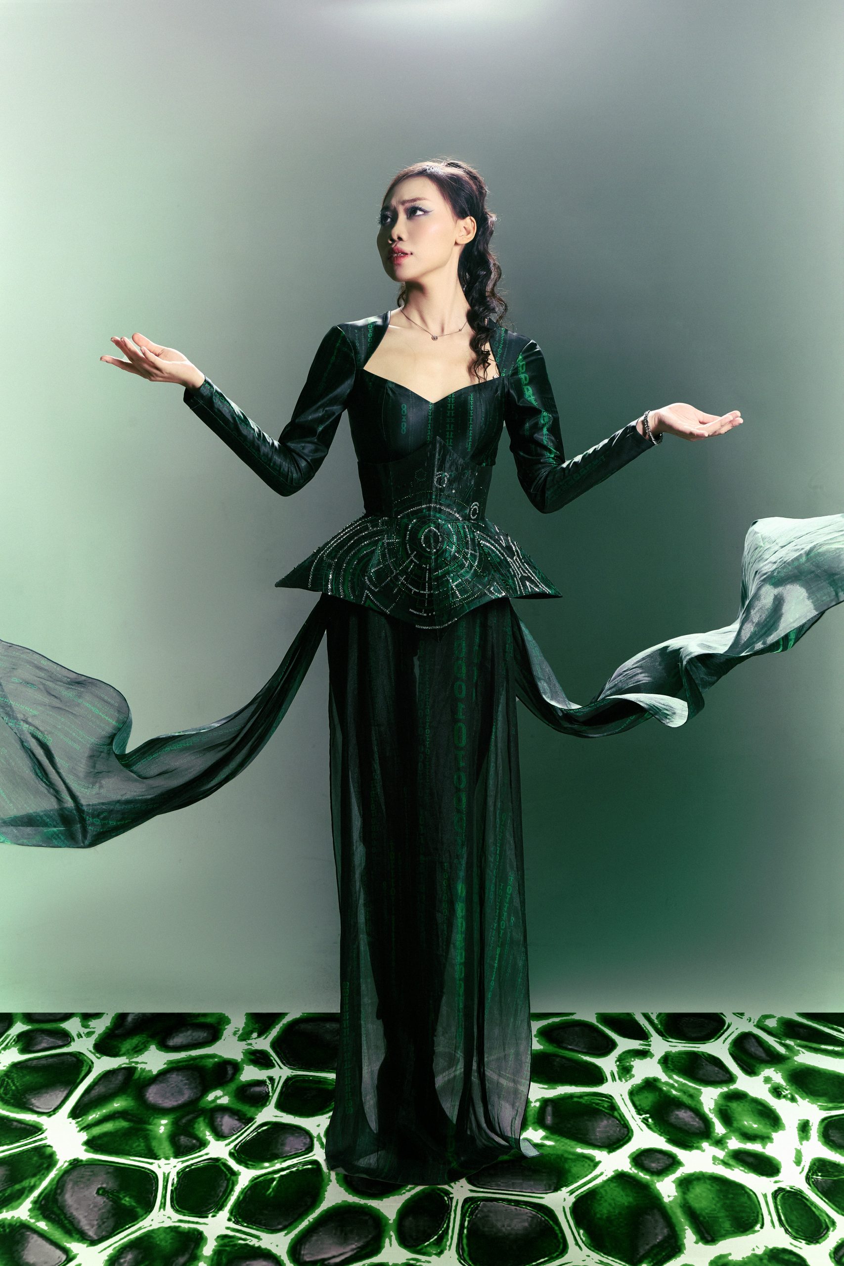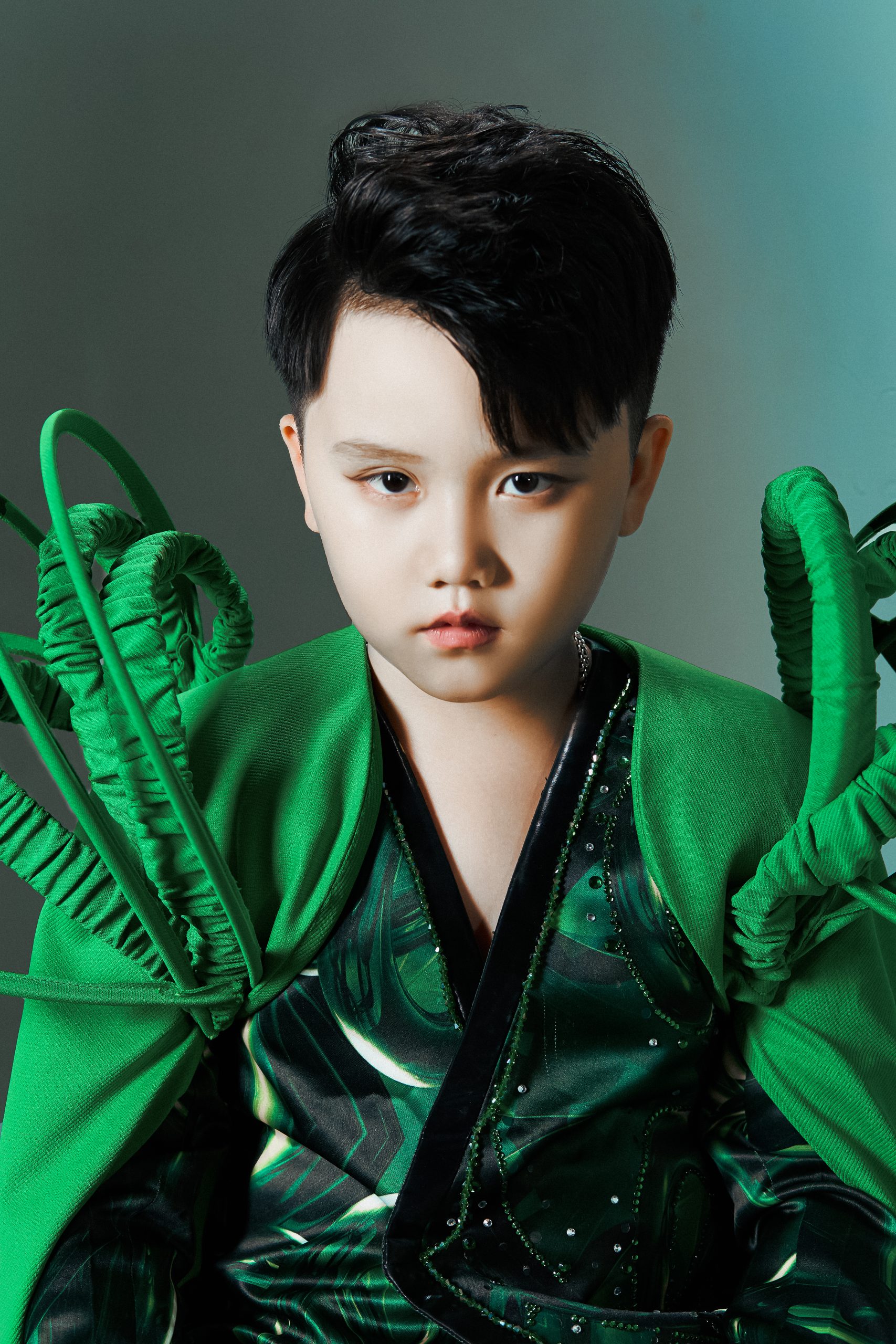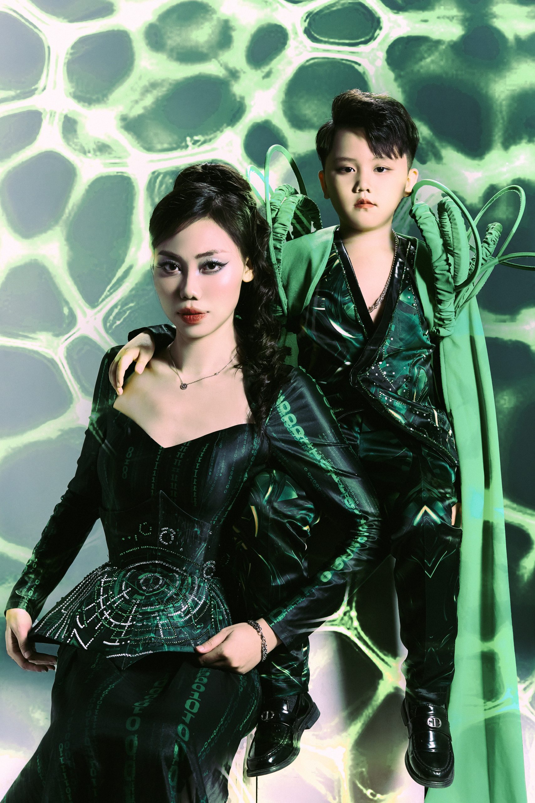 Sự xuất hiện của mẫu nhí Anh Quân với thiết kế xanh lục ánh ngọc trở thành điểm nhấn thị giác và thông điệp. Bộ trang phục với kết cấu mô phỏng sinh vật học, cùng ánh mắt trầm tĩnh của cậu bé, khiến khái niệm “tái sinh” không còn là ẩn dụ. Em chỉ cần đứng yên trong khung hình là đủ truyền cảm giác thuần khiết về một thế hệ mới: hiểu biết hơn, gắn kết hơn và gần gũi hơn với thiên nhiên.