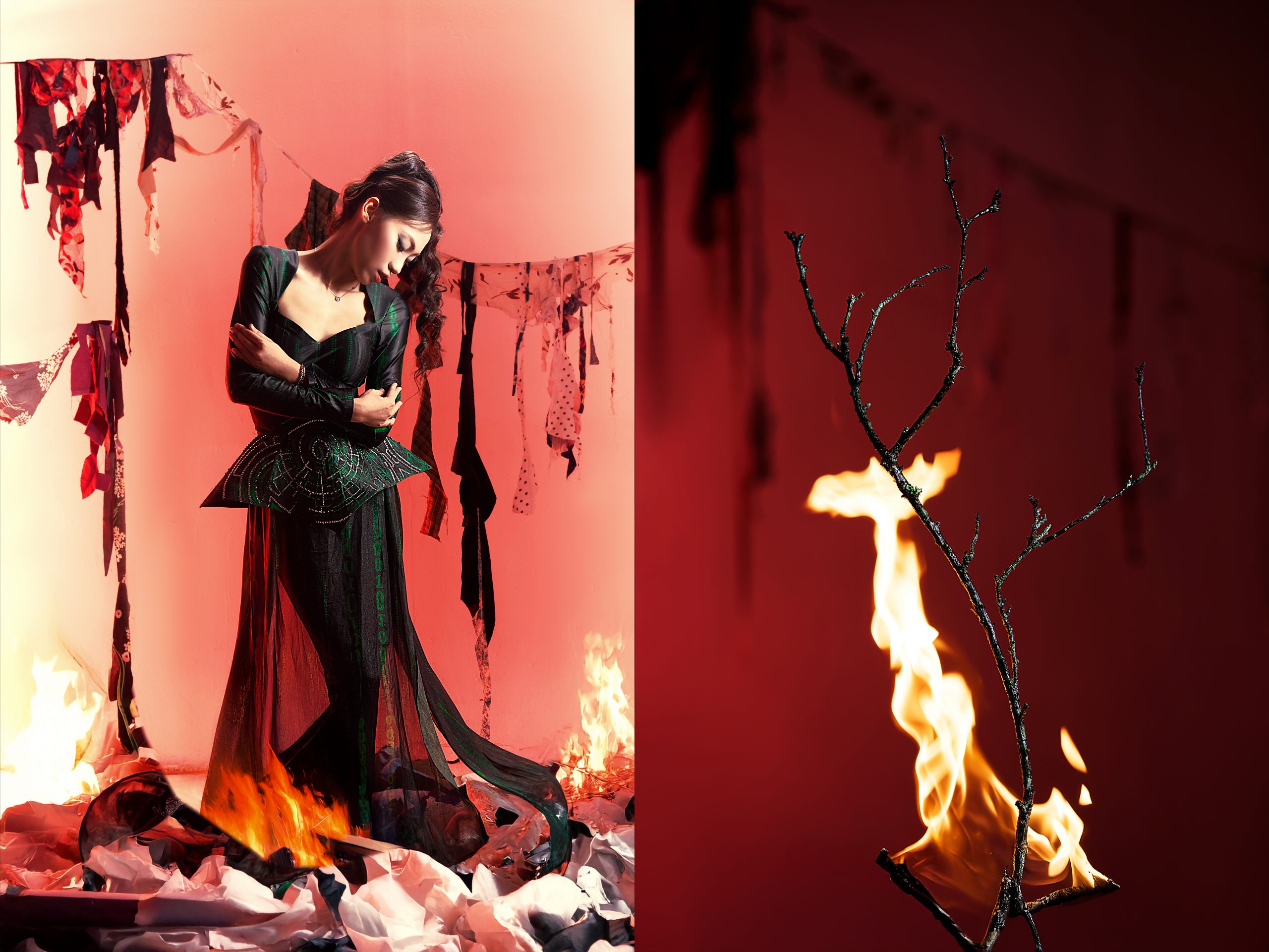 Những khung hình đầu tiên của bộ ảnh phủ một gam màu u ám, rực đỏ trong sắc lửa. Ngọc Minh, người mẫu hiện lên giữa đống vải cháy, ánh nhìn trĩu nặng như gói trọn nỗi đau của Mẹ Thiên Nhiên bị đè nén dưới sức nặng tiêu thụ. Những cành cây bốc cháy, nền đất phủ rác thải dệt may… không phải là hình ảnh minh họa, mà là sự phản chiếu chân thực về hệ quả khi thời trang bị biến thành sản phẩm một lần.