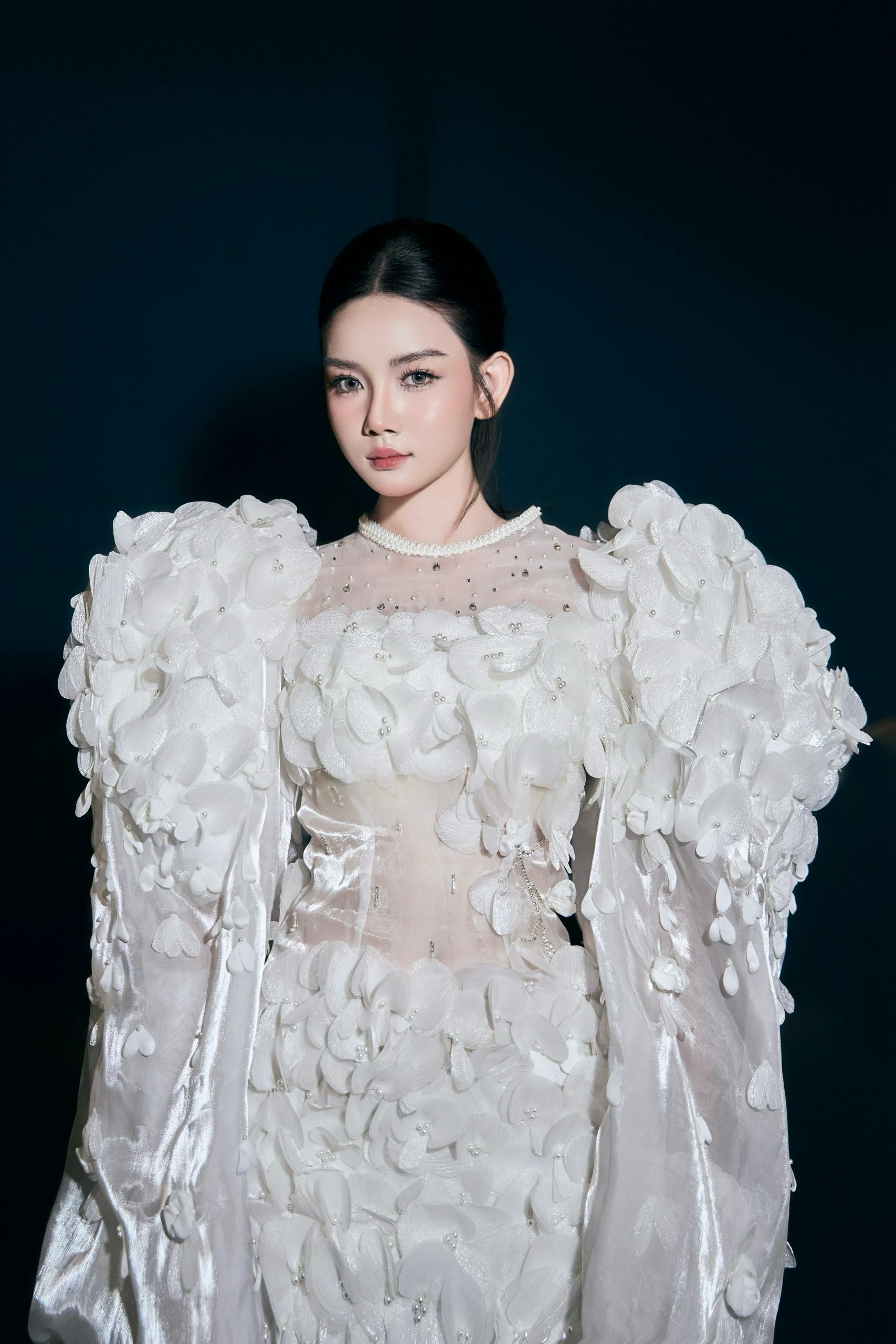 Tú Quyên xuất hiện trong bộ “White Wisteria” với ánh mắt điềm tĩnh, bước catwalk chắc nhịp và vẫn giữ nét uyển chuyển cần có. Thiết kế corset kết hợp chân váy xòe và chi tiết hoa 3D nổi bật, tạo nên những đường nét trẻ trung mà vẫn cuốn hút khi Tú Quyên di chuyển. Cô mang đến hình ảnh một người mẫu tự tin, yêu sàn diễn và tận hưởng từng khoảnh khắc trình diễn trong bộ trang phục gắn liền với dấu ấn tuổi trẻ.