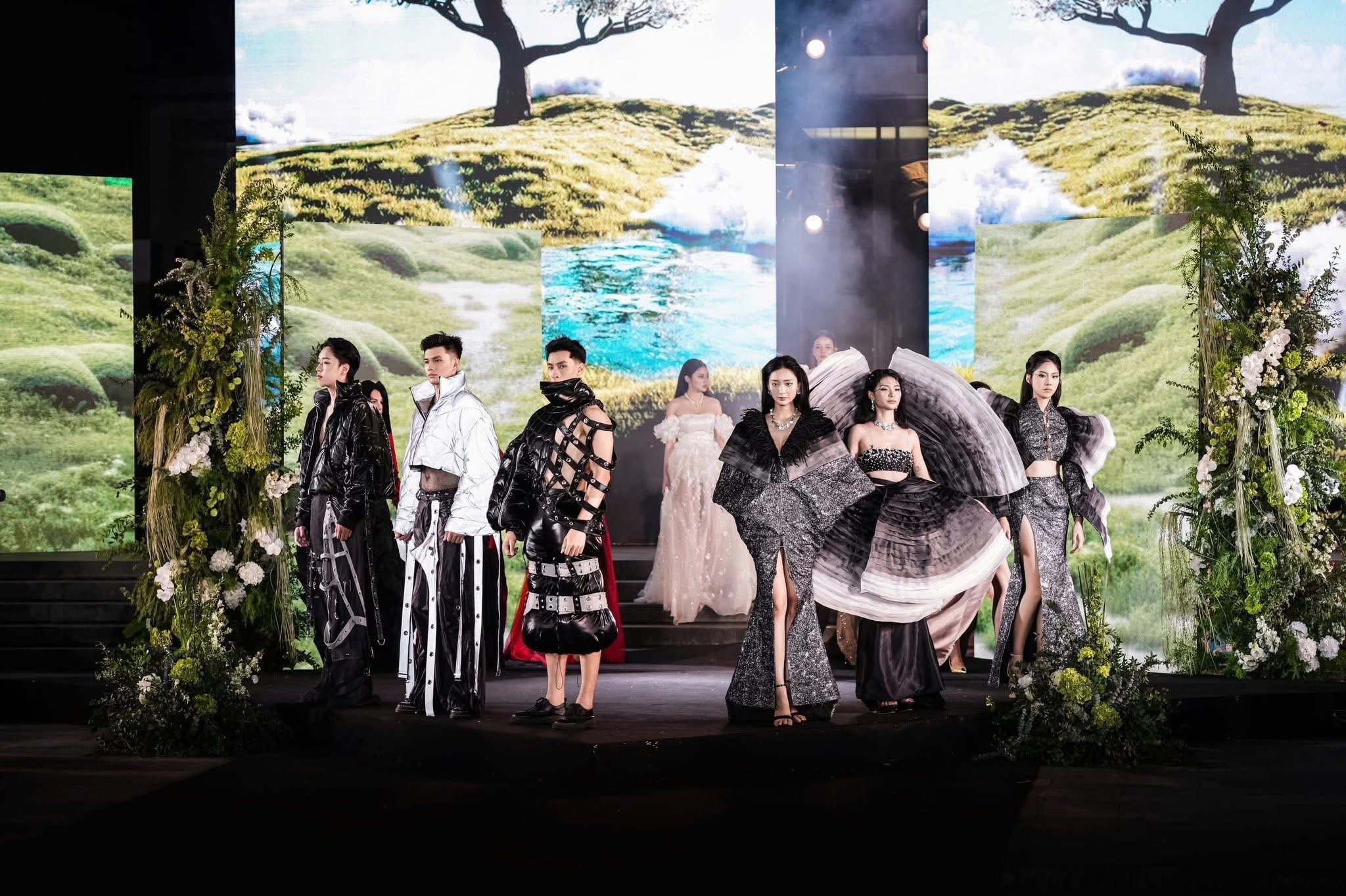 Trên sàn runway, Giang sải bước với nhịp thở đều, từng bước catwalk uyển chuyển, dứt khoát, biến sàn diễn thành không gian của riêng mình. Mỗi lần tà váy xòe nhẹ, từng tia sáng phản chiếu trên nền vải ánh kim, cô như một vì tinh tú đang tỏa sáng, gửi gắm thông điệp về sự sống, về khát khao thức tỉnh và chữa lành.