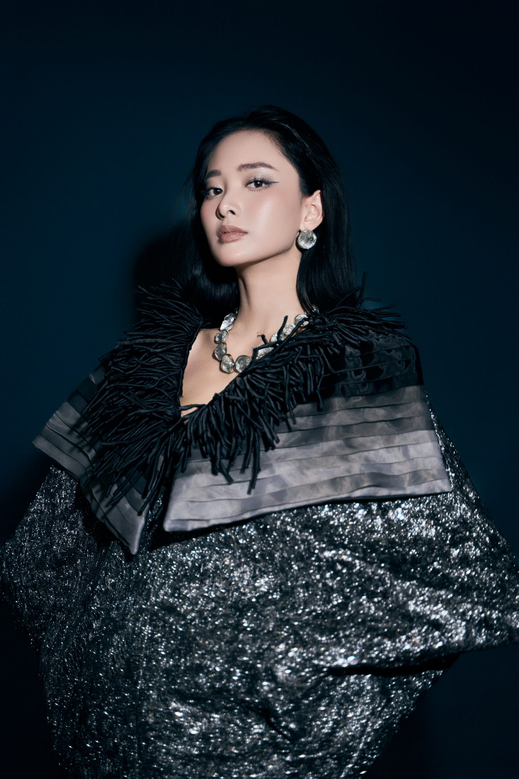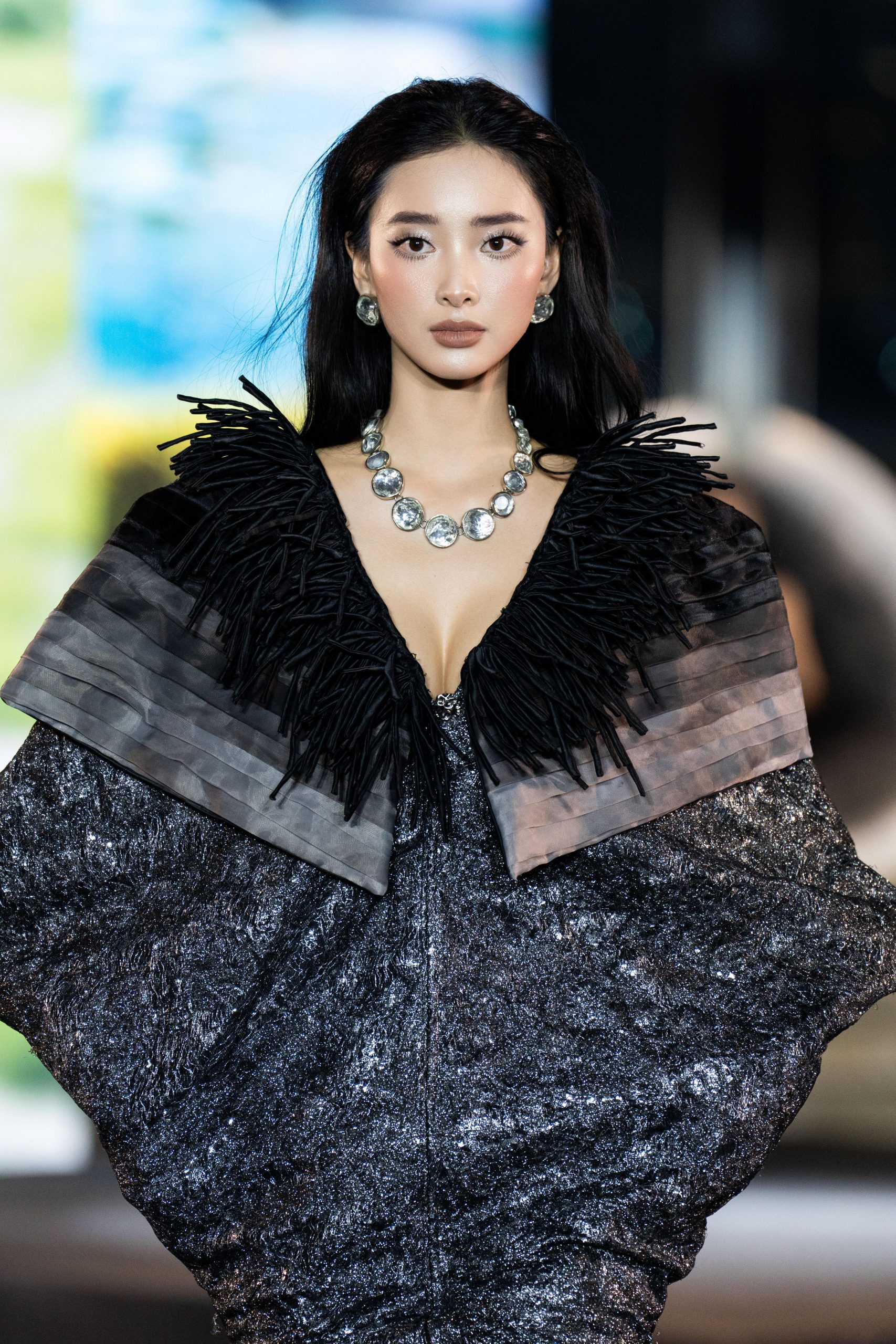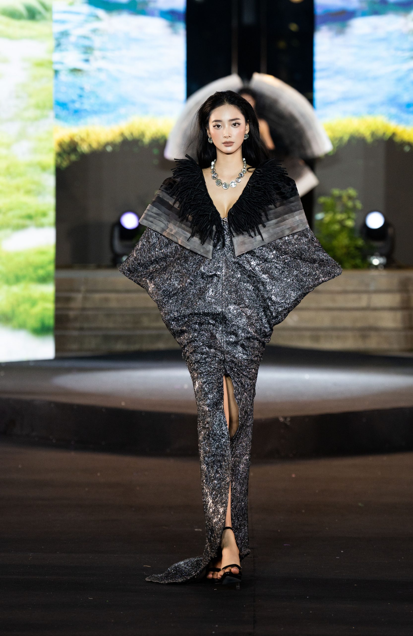 Bảng màu bạc ánh xám lấp lánh dưới ánh đèn sân khấu, phản chiếu ánh sáng như một lớp pha lê nứt vỡ đang rực rỡ giữa màn đêm. Đây chính là ngôn ngữ thời trang thị giác, tái hiện những mảng vỡ cảm xúc, để rồi trên từng bước đi, những ánh bạc lấp lánh ấy trở thành điểm nhấn của khát vọng sống và vượt qua nỗi sợ nội tâm.