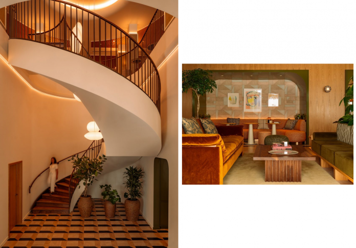 This sense of heritage is further reflected in the material palette used throughout the ground-floor communal areas. The lobby features a dramatic spiral staircase with a balustrade crafted from antique brass and walnut wood, signaling a return to tactile, high-quality craftsmanship. The adjoining lounge area is furnished with floral-print armchairs and mossy-green velvet sofas, echoing the natural hues of the Lea Valley. By prioritizing textures and colors that feel “natural rather than imposed,” the design team has created an entrance experience that feels less like a corporate lobby and more like a warm, residential living room.