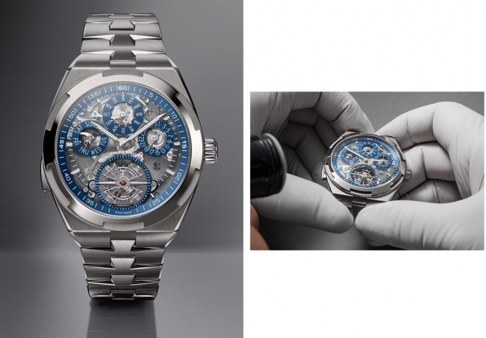 Perhaps the most astonishing technical accomplishment of this watch is the inclusion of a minute repeater that remains water-resistant to 30 meters—a notoriously difficult feat. Typically, slide mechanisms for chimes are vulnerable to moisture, but Vacheron Constantin engineers spent over a year redesigning the system to meet the standards of a sports watch. While the crown does not screw down, the overall architecture ensures a practical and functional level of durability for such a grand complication. Also noteworthy is the thoughtful versatility: the watch ships with not only the integrated titanium bracelet but also a blue alligator strap and a blue rubber strap, both of which can be swapped out without tools thanks to the brand’s quick-change system.