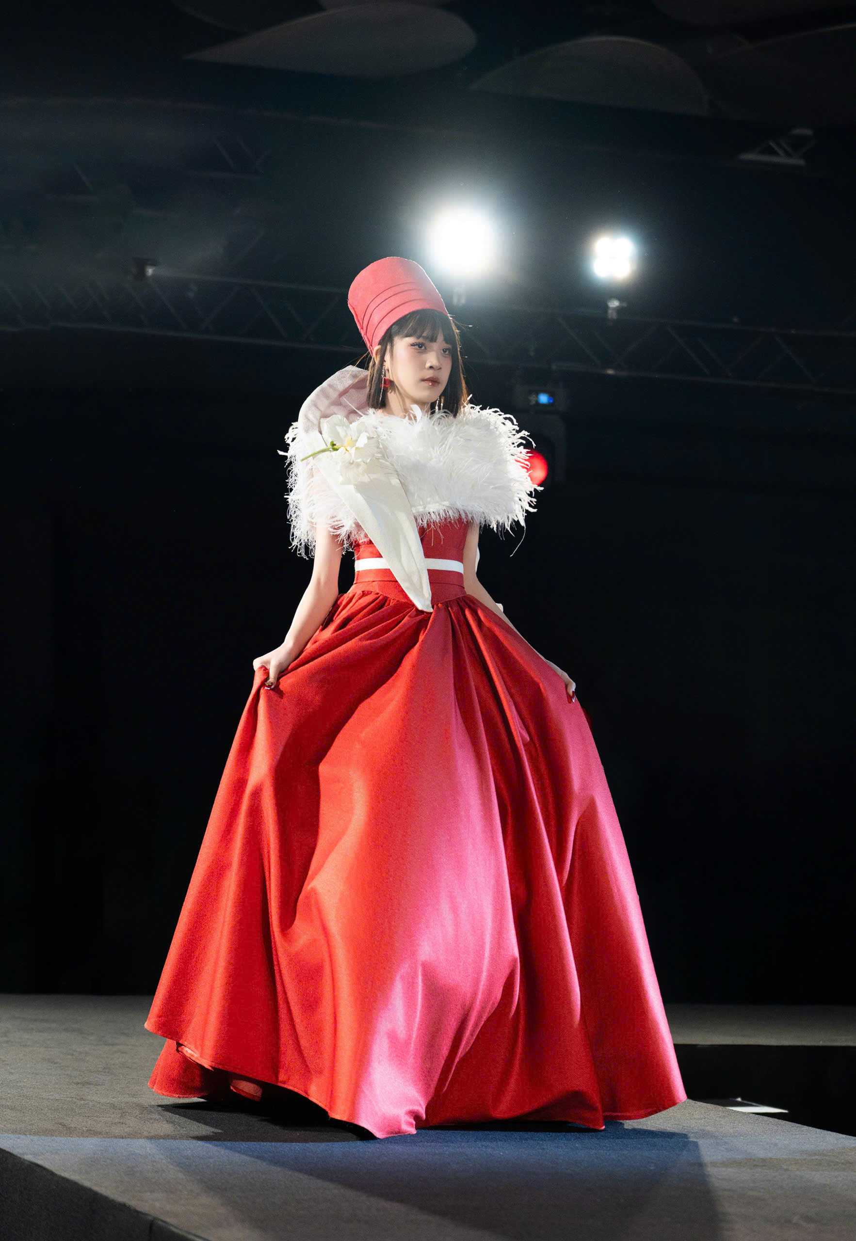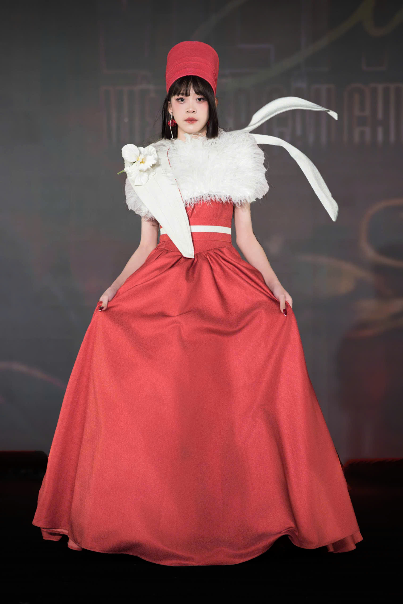 Điểm nhấn đặc biệt trong tạo hình của Phẩm Như là chiếc nón cao đồng màu đỏ, gợi nhắc đến những nét đặc trưng trong trang phục cung đình xưa nhưng được biến tấu đầy hiện đại. Layout trang điểm tập trung vào đôi mắt có độ sâu và đôi môi đỏ mọng, giúp mẫu nhí giữ được sự trẻ trung, đồng thời làm nổi bật thần thái quyền quý. Từng chi tiết từ phụ kiện bông tai đến đoá hoa trắng bản lớn đính trên vai áo đều được tính toán kỹ lưỡng, tạo nên một tổng thể hài hòa và thống nhất với thông điệp về sự bình yên mà nhà thiết kế Lê Trần Đắc Ngọc muốn gửi gắm.