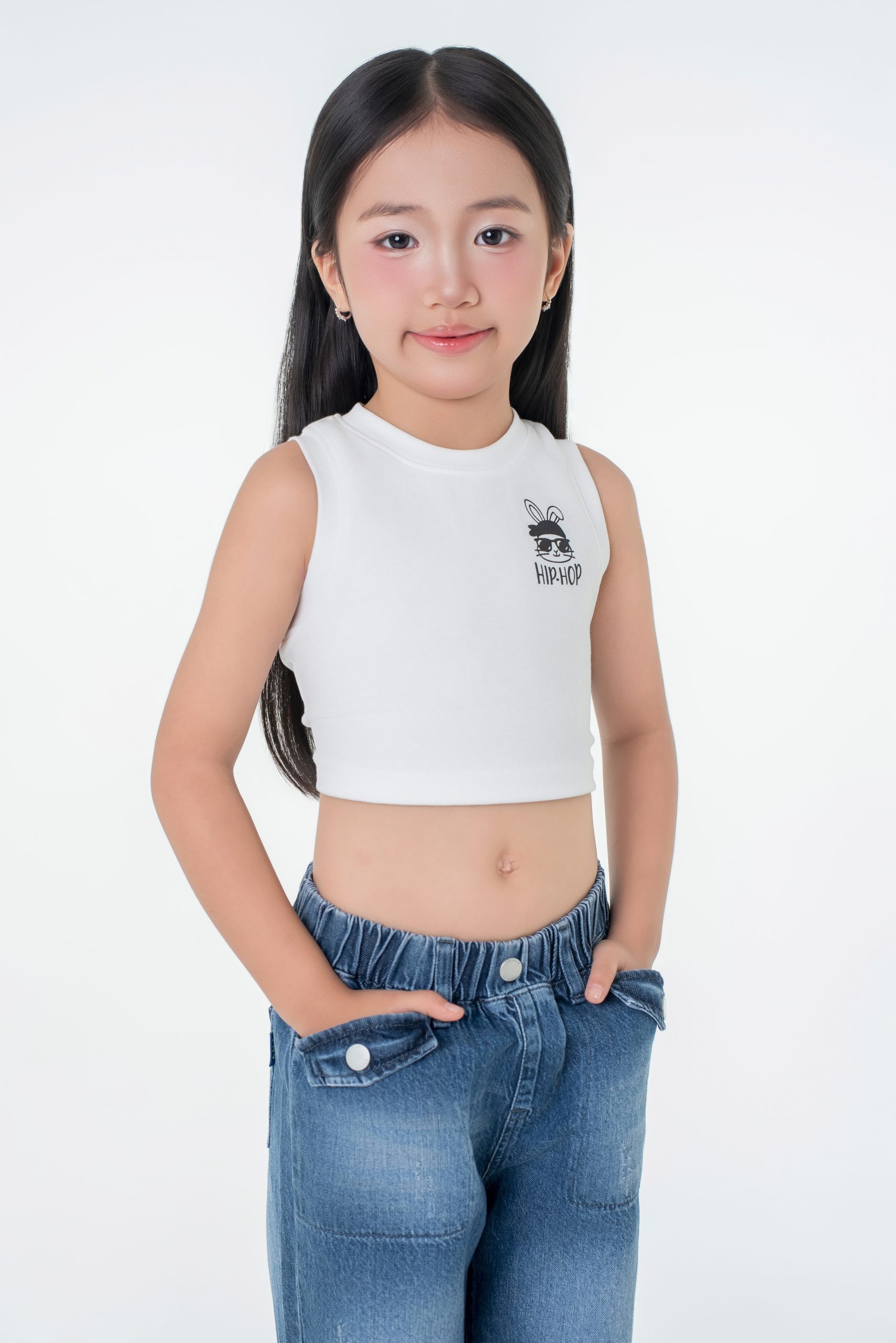 Trong loạt ảnh đầu tiên, Mai Khuê xuất hiện với trang phục trắng phối cùng quần jean, tạo cảm giác khỏe khoắn và năng động. Ánh sáng tự nhiên giúp khung hình trở nên hài hòa, đồng thời làm nổi bật gương mặt và thần thái tự tin của mẫu nhí. Các góc chụp được xử lý linh hoạt, từ cận cảnh đến toàn thân, mang lại sự sinh động mà vẫn giữ được nét hồn nhiên đúng lứa tuổi.