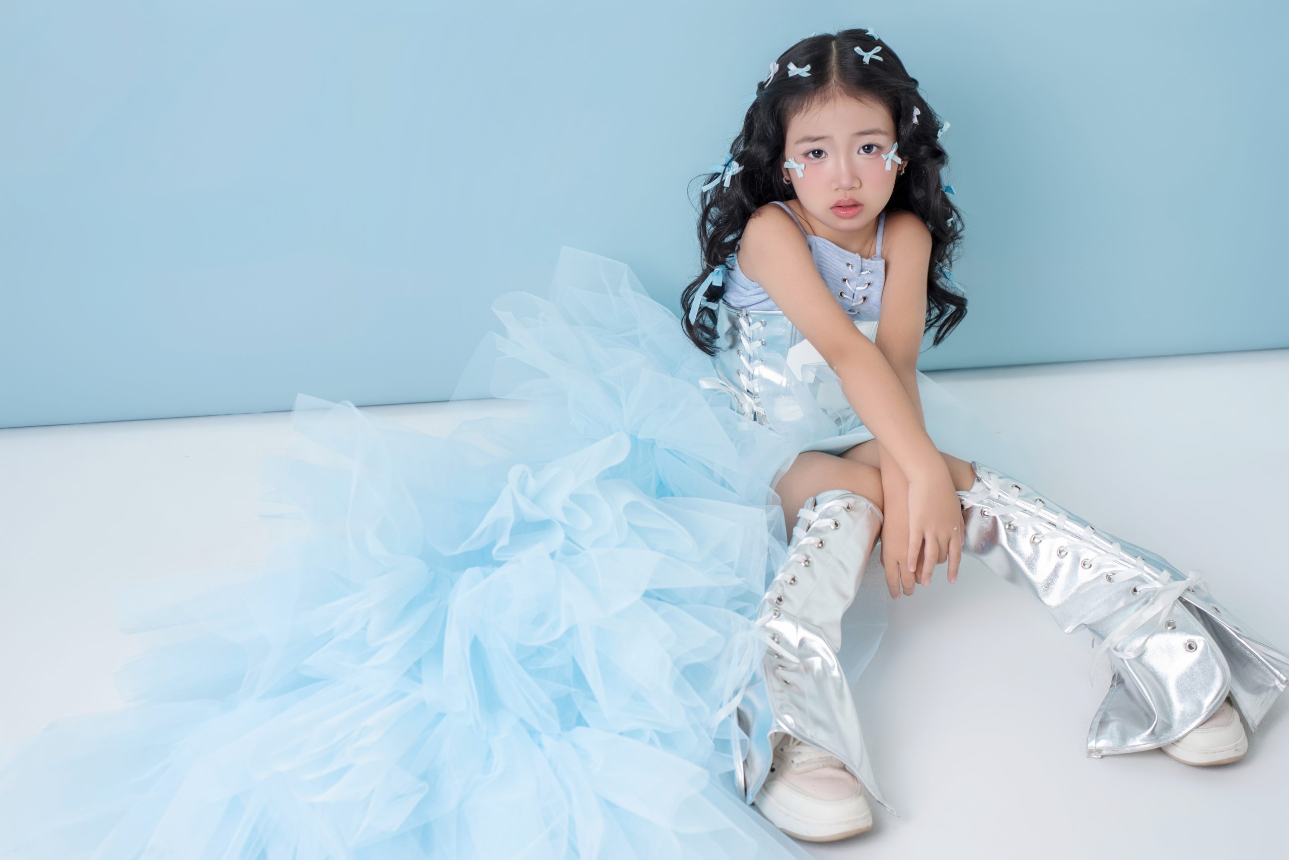 Ở concept cuối, Mai Khuê hóa thân thành một “nàng thơ nhỏ” trong chiếc váy xanh băng của NTK Ada Anh Trương. Tông màu dịu và ánh sáng mềm giúp tôn lên nét trong trẻo. Các khung hình được dàn dựng giản dị nhưng có điểm nhấn, tập trung vào ánh sáng và biểu cảm, tạo nên cảm giác gần gũi, đúng tinh thần “thời trang dành cho trẻ nhỏ” mà ê-kíp hướng tới.