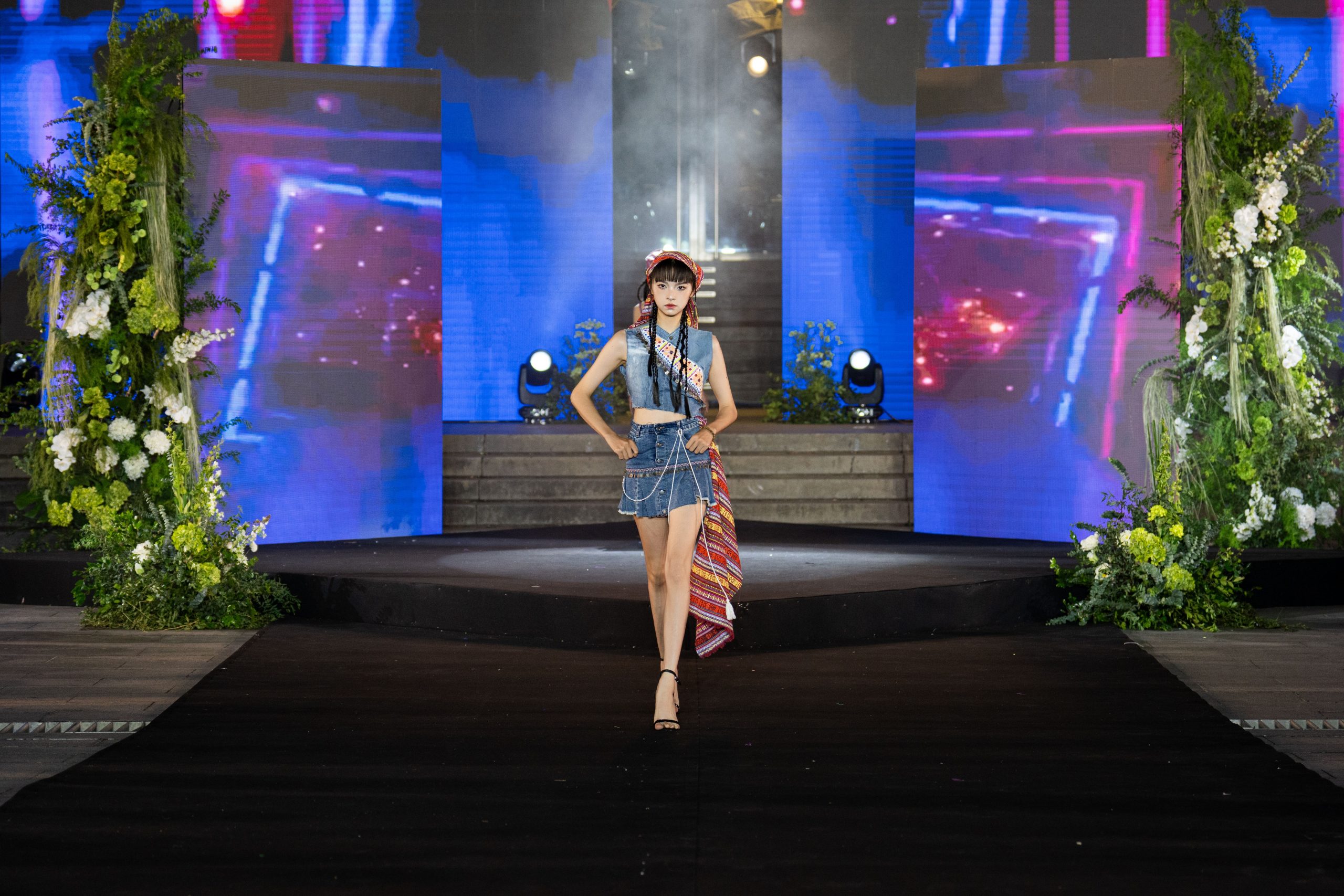 Trên nền chất liệu denim vững chắc, từng họa tiết thổ cẩm được lựa chọn kỹ lưỡng, gắn thủ công, giúp từng bước catwalk thêm phần sống động. Kỹ thuật xử lý mép vải, đường cắt gấu tua, độ rũ mềm khi di chuyển đều được chăm chút, để thiết kế denim thổ cẩm vừa giữ form dáng, vừa nhẹ nhàng khi bước đi, giúp người mặc cảm thấy thoải mái và tự tin.