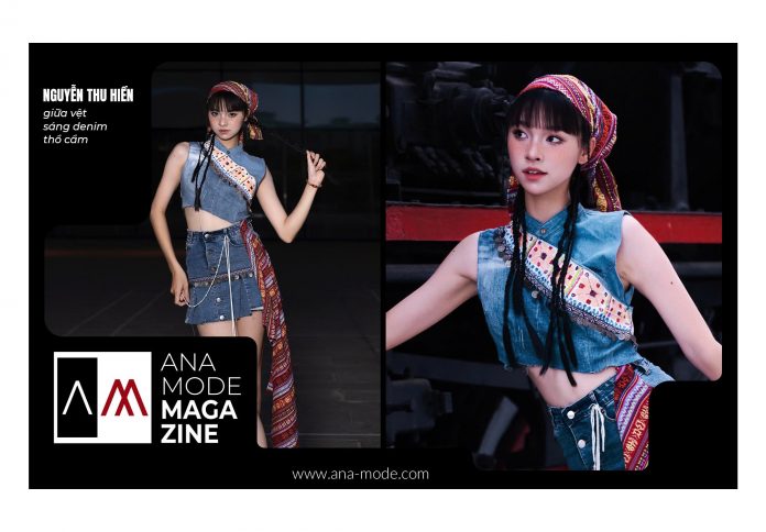 Điểm nhấn của thiết kế đến từ dải thổ cẩm sắc đỏ, vàng, tím chạy chéo từ vai xuống thân áo. Sợi tua kim loại ánh bạc được gắn xen, từng chuỗi hạt nhỏ khẽ chạm vào nhau trên sàn diễn, mang đến nhịp điệu thanh âm nhẹ khi Hiền di chuyển. Dải thổ cẩm này giữ trọn giá trị thủ công của các họa tiết truyền thống, trở thành nét gợi nhắc văn hóa miền núi được tái hiện một cách hiện đại trên nền denim.