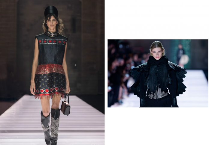 As the models took to the runway, Ghesquière’s vision unfolded in layers of rich contrasts and playful anachronisms. The collection was a tribute to outsiders and dreamers—“medieval misfits” and “princesses who prefer punks to white knights,” as one might describe it. Romantic elements like ruffles, chiffon, and jacquard weaved seamlessly with tougher materials such as leather, geometric embroidery, and metallic accents.
