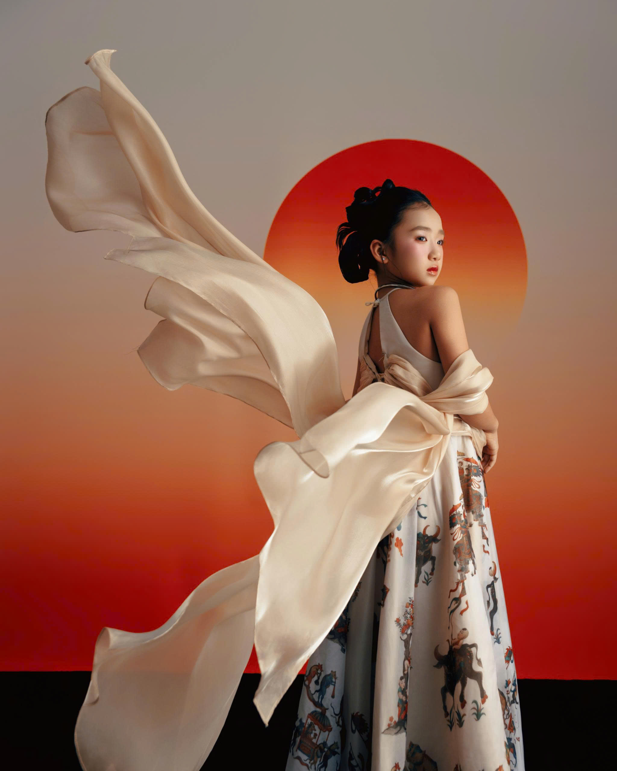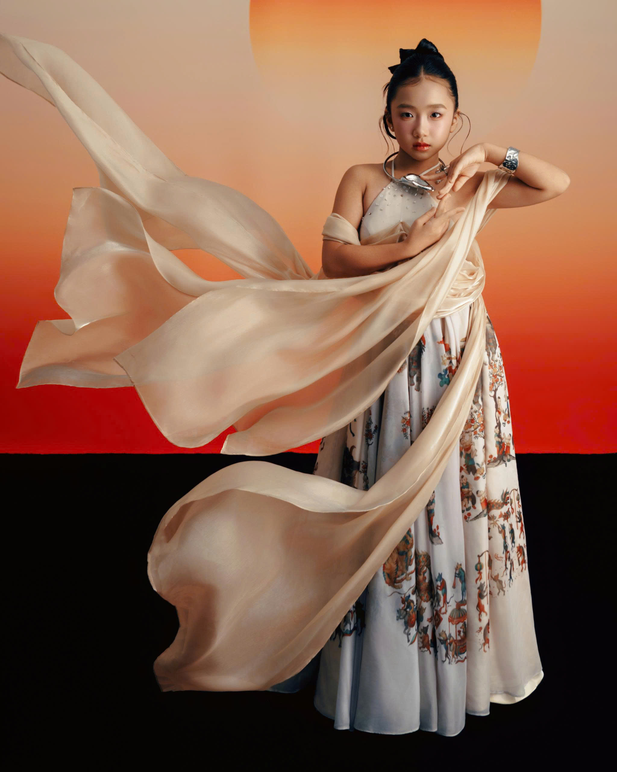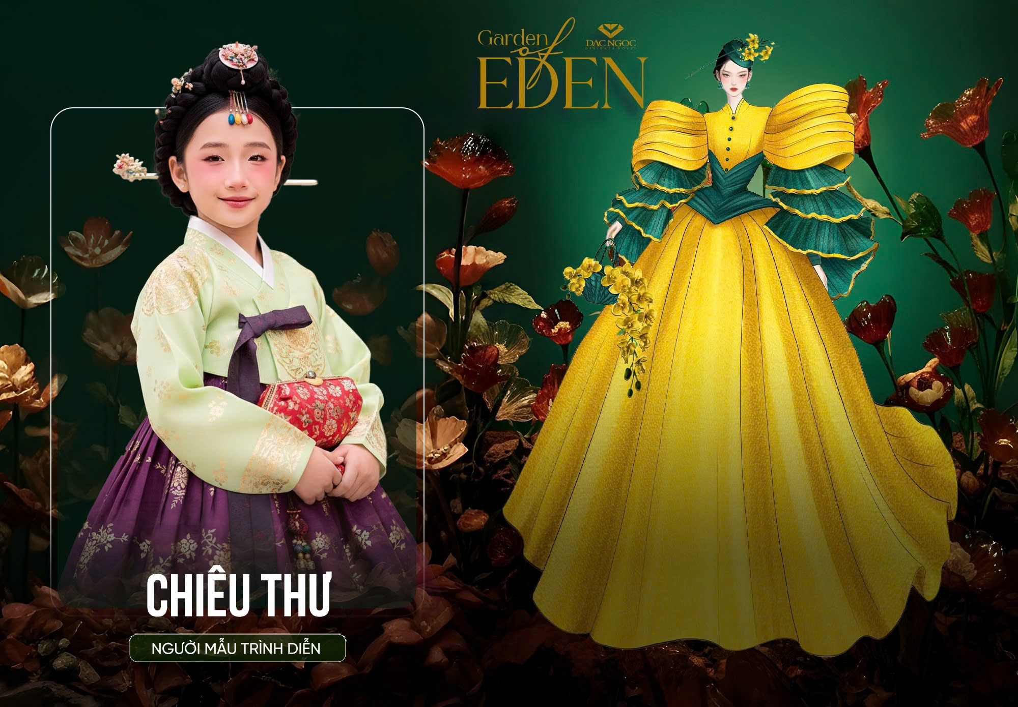 Điểm nhấn của bộ trang phục nằm ở phần vai áo thiết kế phồng xếp lớp tạo vẻ uy nghi, kết hợp với chân váy xòe rộng mang hơi hướng phong cách hoàng gia. Chi tiết đính kết thủ công cùng phụ kiện nhành lan vàng rực rỡ trên tay giúp Chiêu Thư hóa thân thành một nàng thơ lạc bước giữa khu vườn địa đàng xanh mướt. Sự chuyển đổi linh hoạt trong biểu cảm cùng cách xử lý tùng váy điêu luyện giúp cô bé lột tả trọn vẹn thông điệp về vẻ đẹp thiên nhiên mà nhà thiết kế muốn gửi gắm.