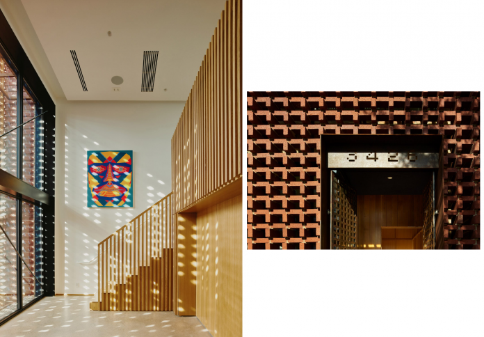 Inside, light filters through dappled openings and subtle shadows accentuate the layered volumes. The project’s palette remains grounded in the tactile warmth of brick and timber, generating a quietly refined showroom atmosphere.
