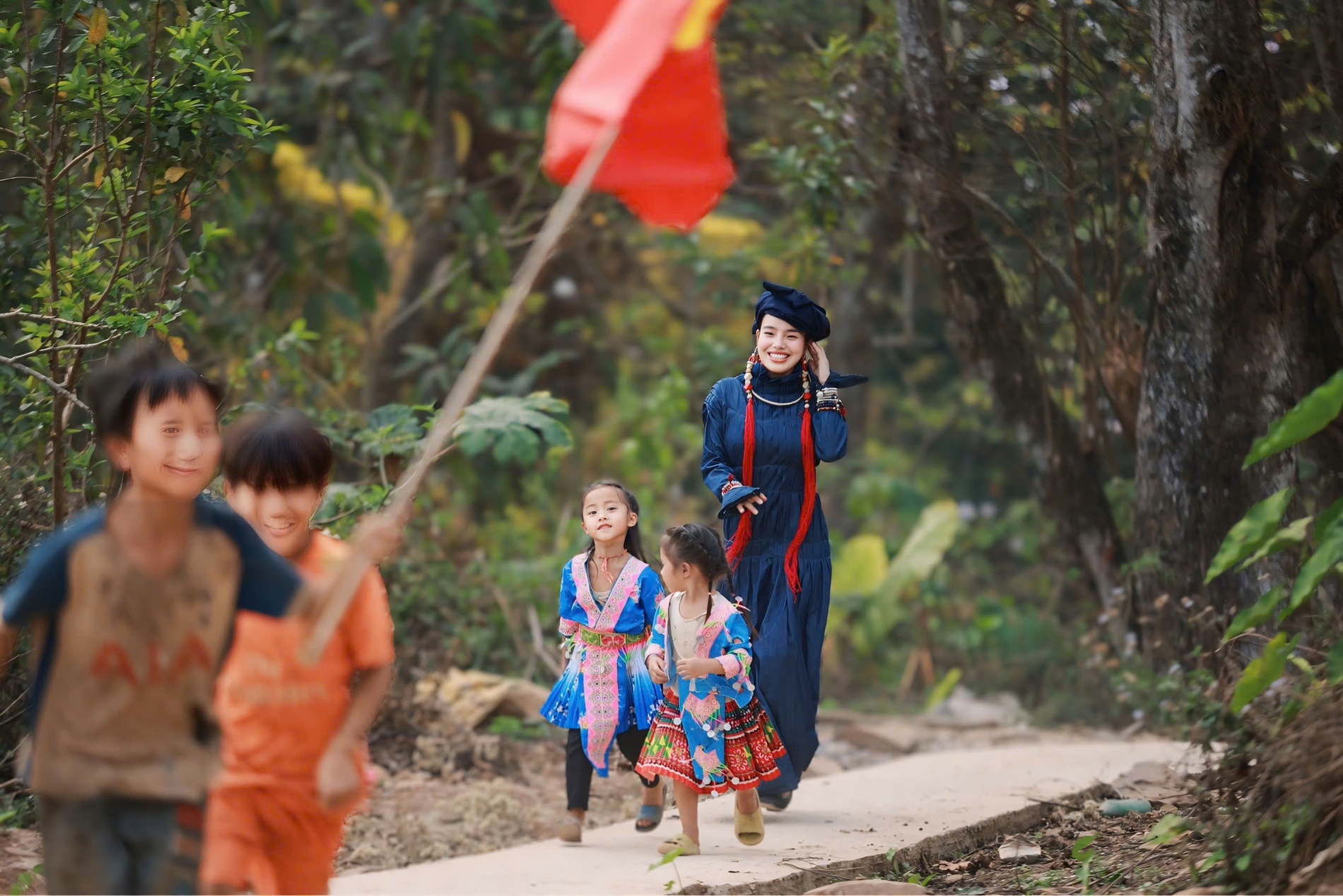 Speaking about the deeper meaning behind the photo series, the designer shared: “Amid the pure white of forest blossoms and the innocent laughter of children, this photo series is a gentle yet profound tribute to the highland lands—where patriotism is not declared in grand words, but deeply felt in every innocent gaze, in the traditional garments still lovingly preserved, and in the quiet yet powerful faith of those who live among the great mountains. As a stylist, I do not just embellish beauty; I want to tell a story—that love for one’s country can begin with the simplest of things, and even from the highest points of the sky, there are hearts that day and night turn toward the homeland with all their love and cultural identity.”