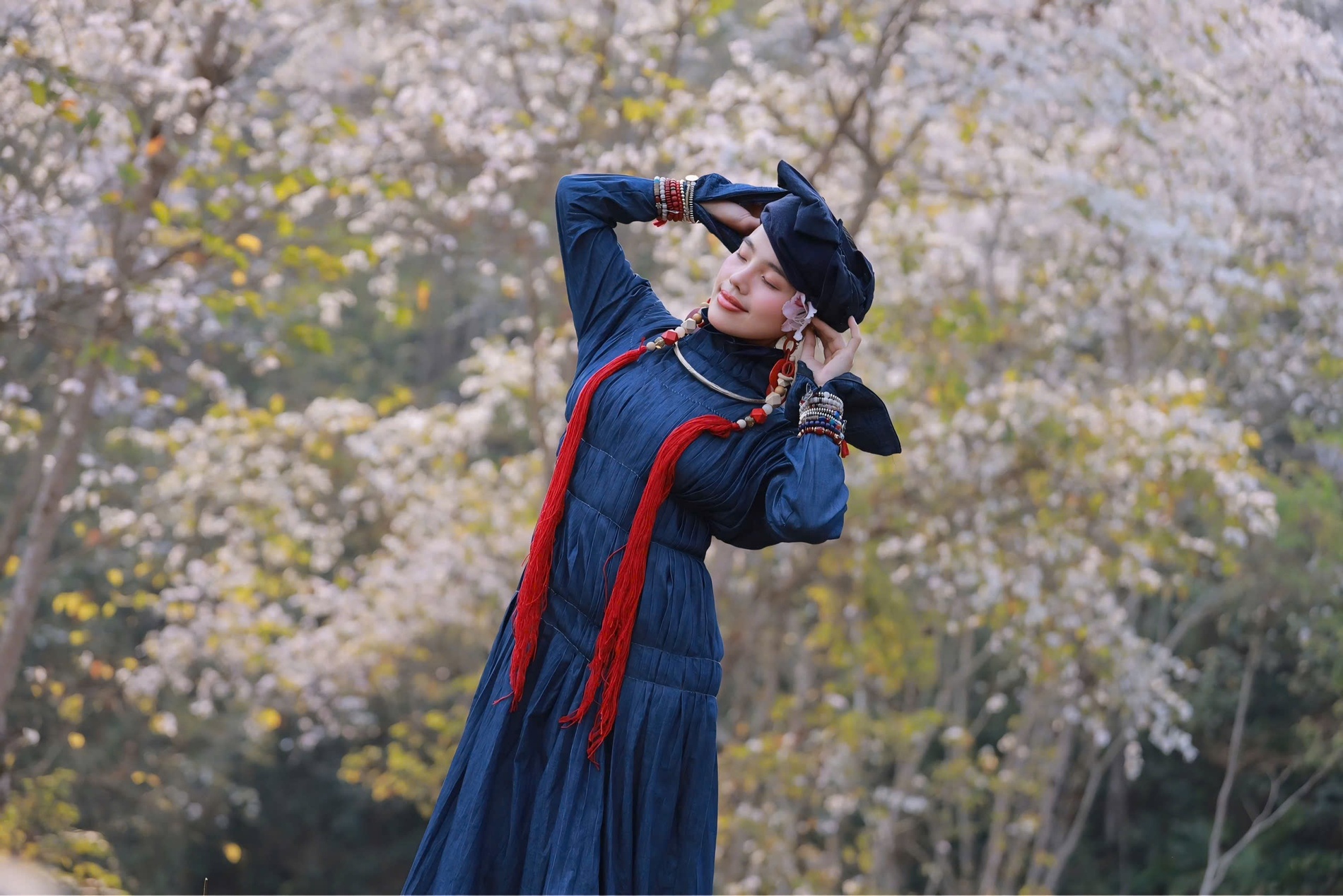 Amid the vast sea of white blossoms in the mountains and forests, the silhouette of the young woman appears like a spring melody—gentle yet radiant. The outfit she wears is dyed in a deep indigo hue, as if gathering all the colors of the mountains, the forests, and the memories of a time that was harsh yet filled with affection.