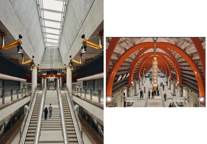 The architects intentionally left much of the raw concrete and structural elements visible, honoring the immense technical achievement of boring and constructing the tunnels. Against this “backdrop of bold, exposed civil-engineering structures,” detailed elements were introduced to enhance the human experience. These included sculptural lighting fixtures, brightly coloured structural elements, and unique finishes. For example, the interiors of State Library Station feature artistic panels set between concrete columns, while the vaulted roof at Town Hall Station is dramatically supported by tree-shaped columns, creating visually rich and engaging spaces.