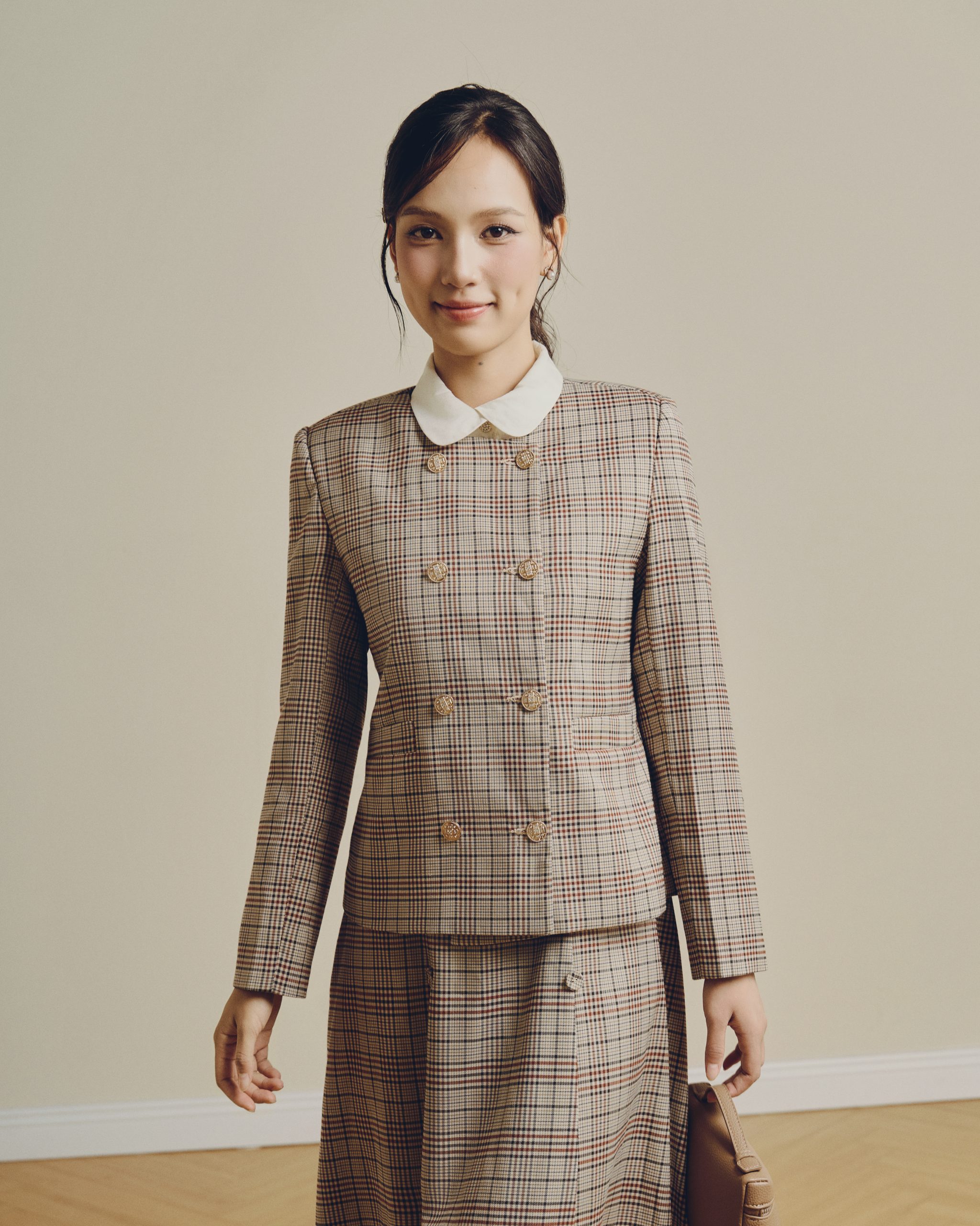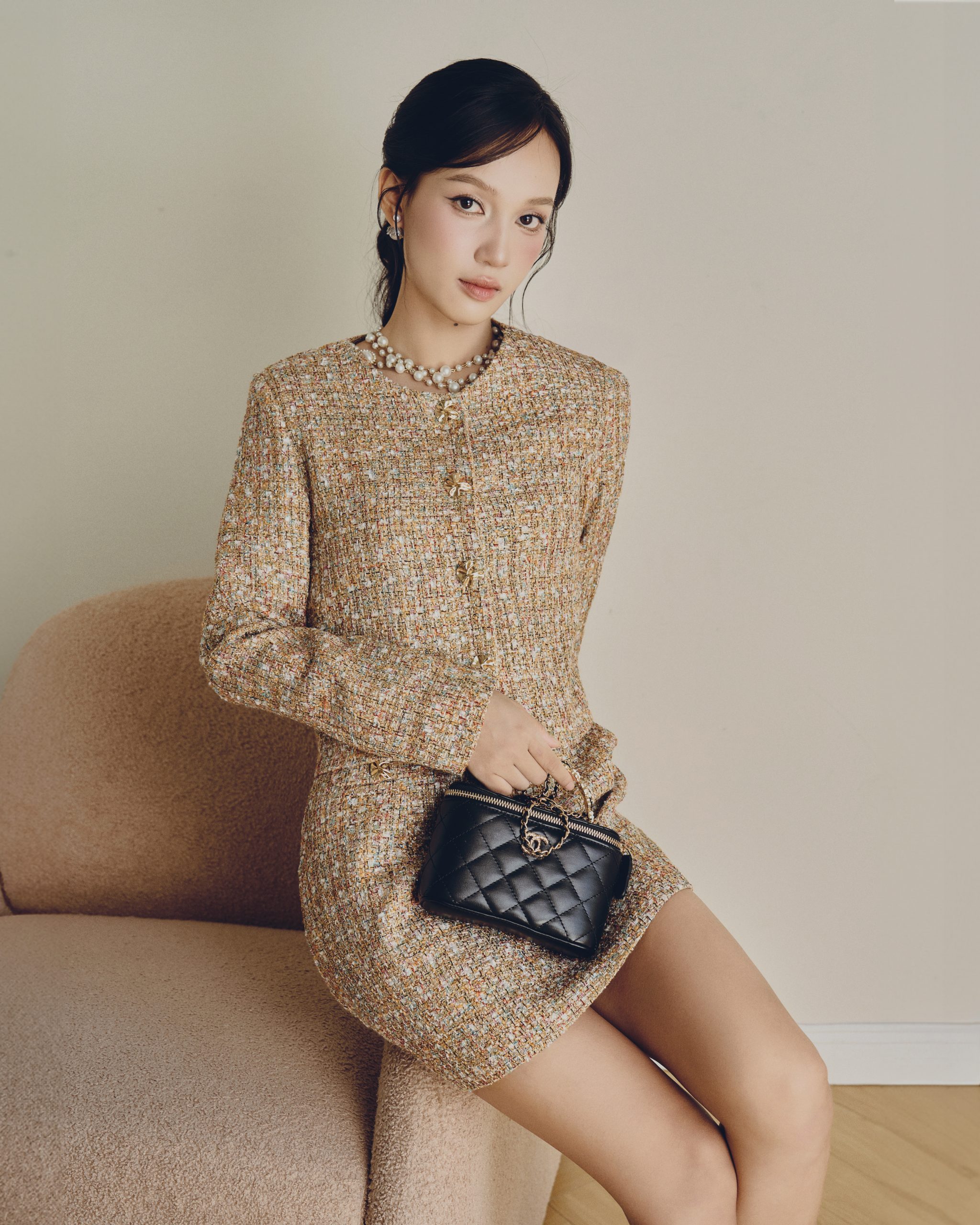 Mỗi bộ trang phục trong “Define Her” được xây dựng như một bản giao hưởng giữa kỹ thuật và cảm xúc. Chiếc váy tweed dáng ngắn phối cùng túi da chần bông tạo ấn tượng về sự thanh lịch trẻ trung. Áo khoác be phối chân váy midi lại mang nét điềm tĩnh, chuẩn mực của những quý cô yêu sự trang nhã và tinh tế.