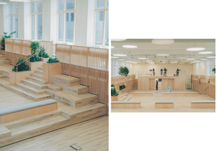 At the pool’s former deep end, the architects introduced an elevated stage suitable for lectures, performances, and assemblies. Capitalizing on the vertical depth beneath this stage, an enclosed IT room was cleverly tucked away, sealed by sliding wooden doors. Around the perimeter of the former pool, fixed desks framed by slatted timber panelling were installed, ideal for individual study and small group work. Tiered seating and informal plywood benches are scattered across the various levels, designed to encourage relaxed studying and spontaneous student interaction.