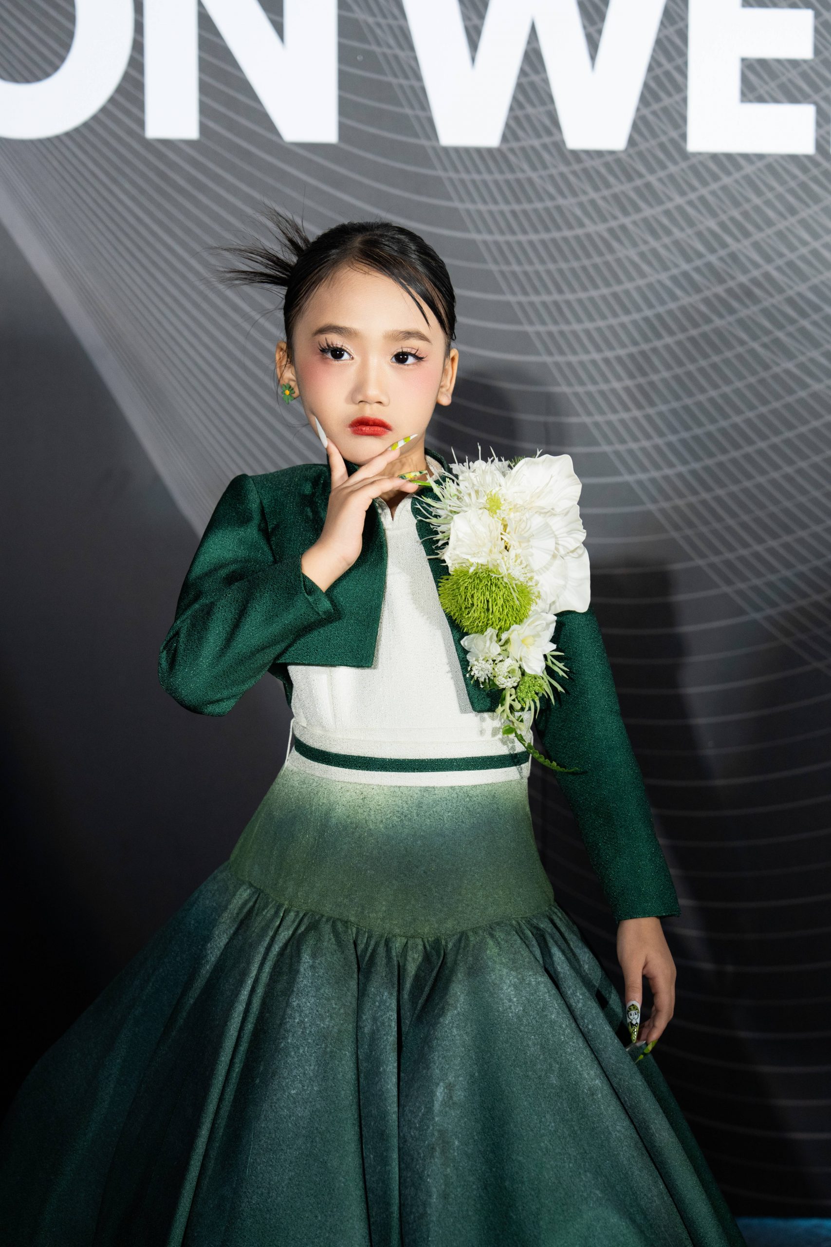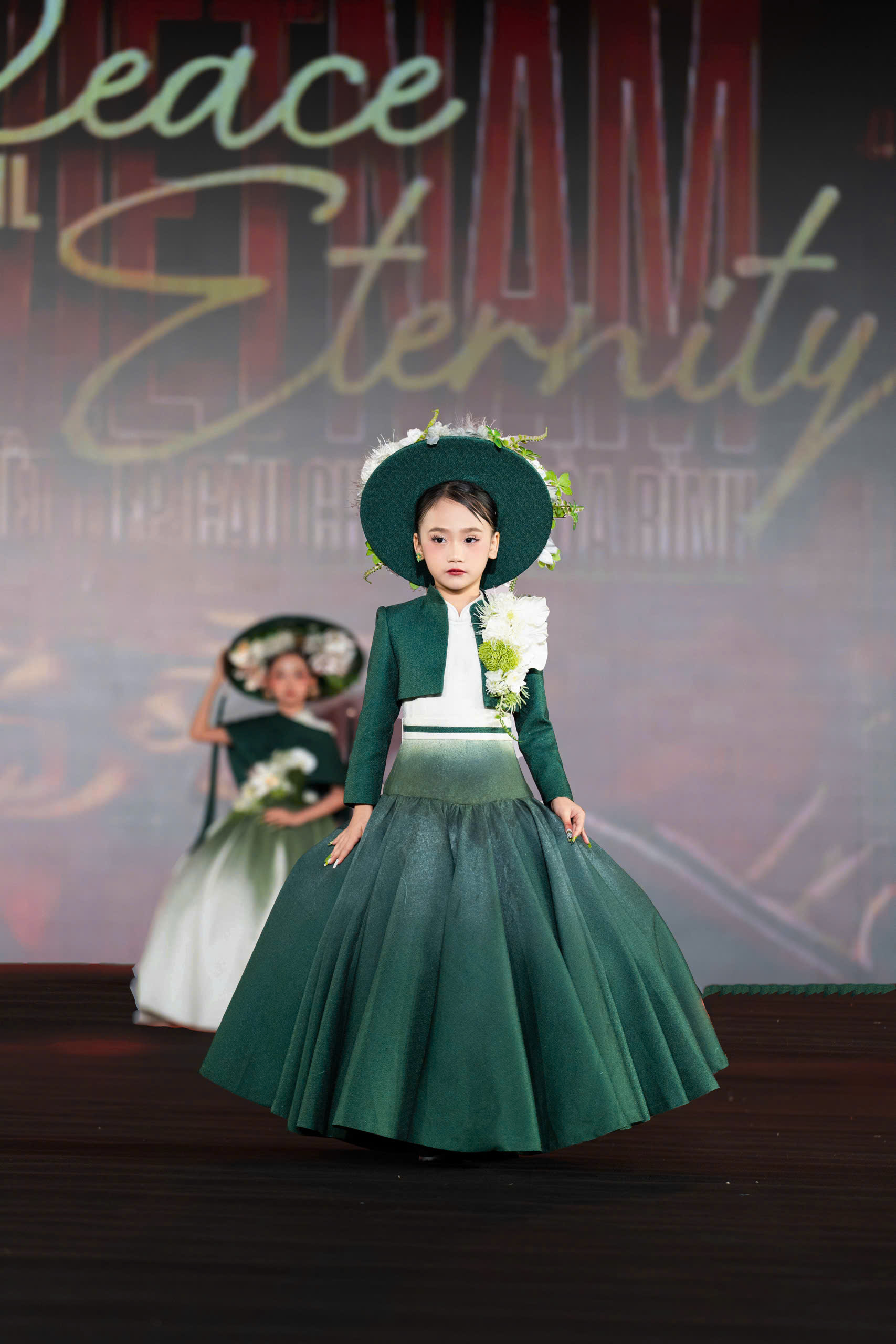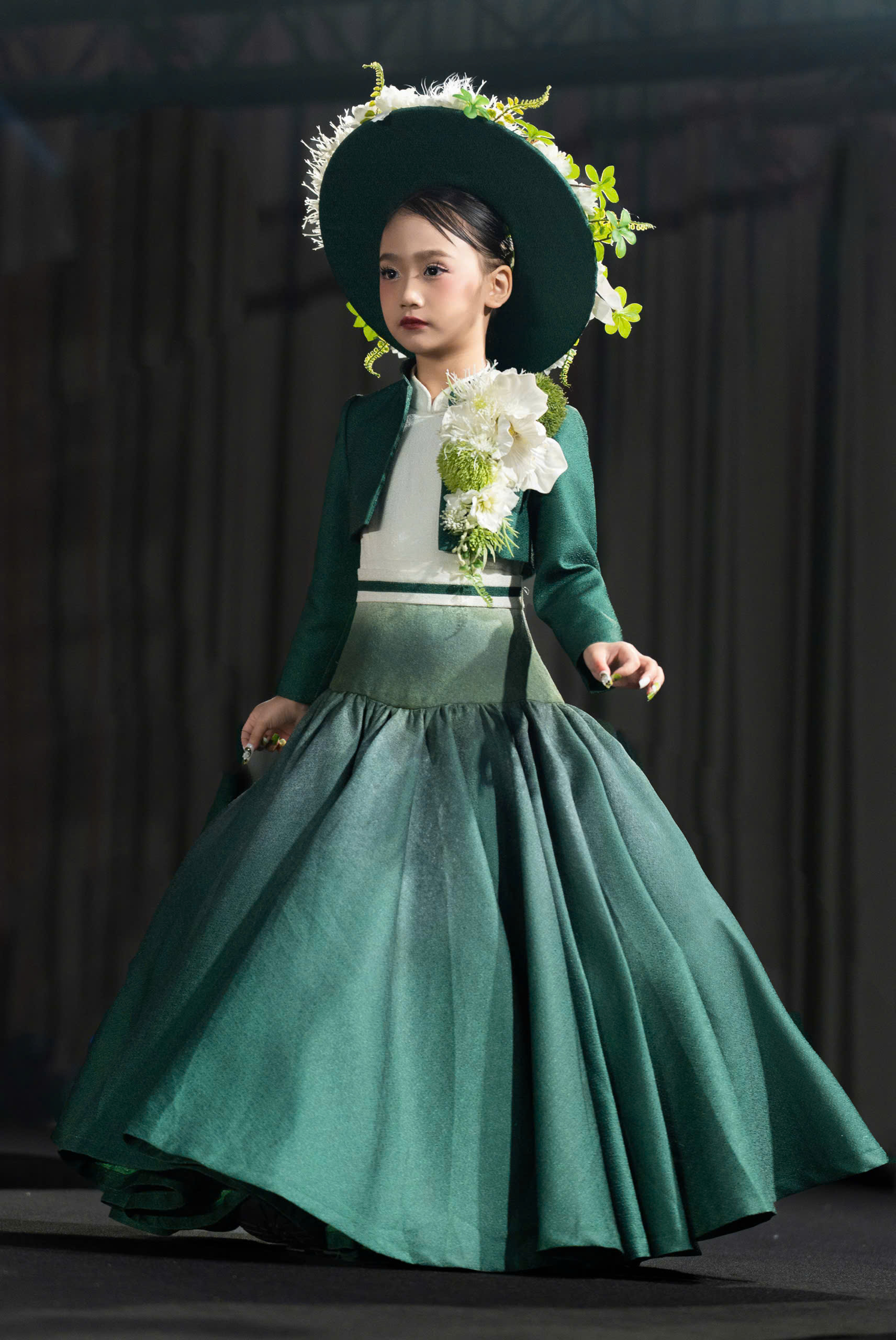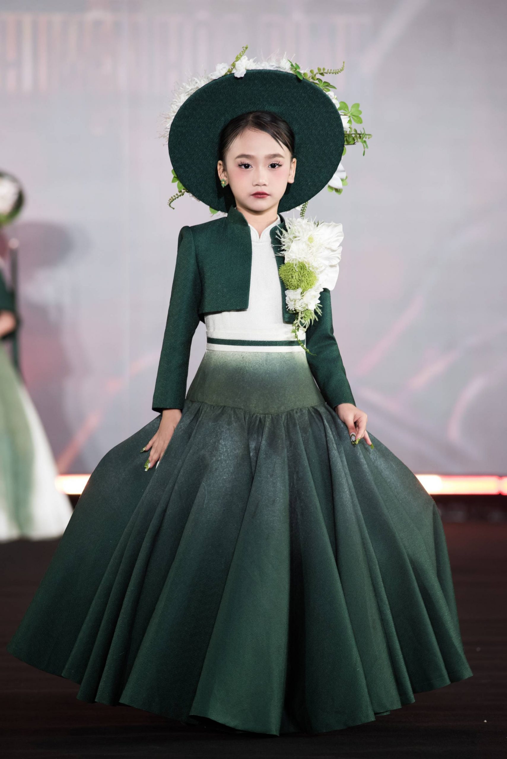 Điểm nhấn khác biệt trong diện mạo của Tâm Đan tại Taipei 2026 chính là chiếc nón rộng vành mang sắc xanh đồng nhất với trang phục. Phụ kiện này được đính kết cầu kỳ với những nhành hoa trắng và xanh rủ nhẹ, bao quanh gương mặt thanh tú của mẫu nhí. Lựa chọn này không chỉ tạo nên sự sang trọng, đài các mà còn làm bật lên vẻ đẹp thoát tục, giúp Tâm Đan trở thành một trong những gương mặt có tạo hình lạ mắt nhất trong đoàn.