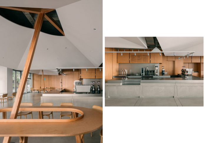 To acknowledge this unique, semi-external environment and provide an intimate, secluded experience, Atelier Tao+C introduced two colossal, slanted elements into the ceiling. These elements are referred to as “canvases” or “canopies,” and are described as creating an “outdoor feeling” within the interior.