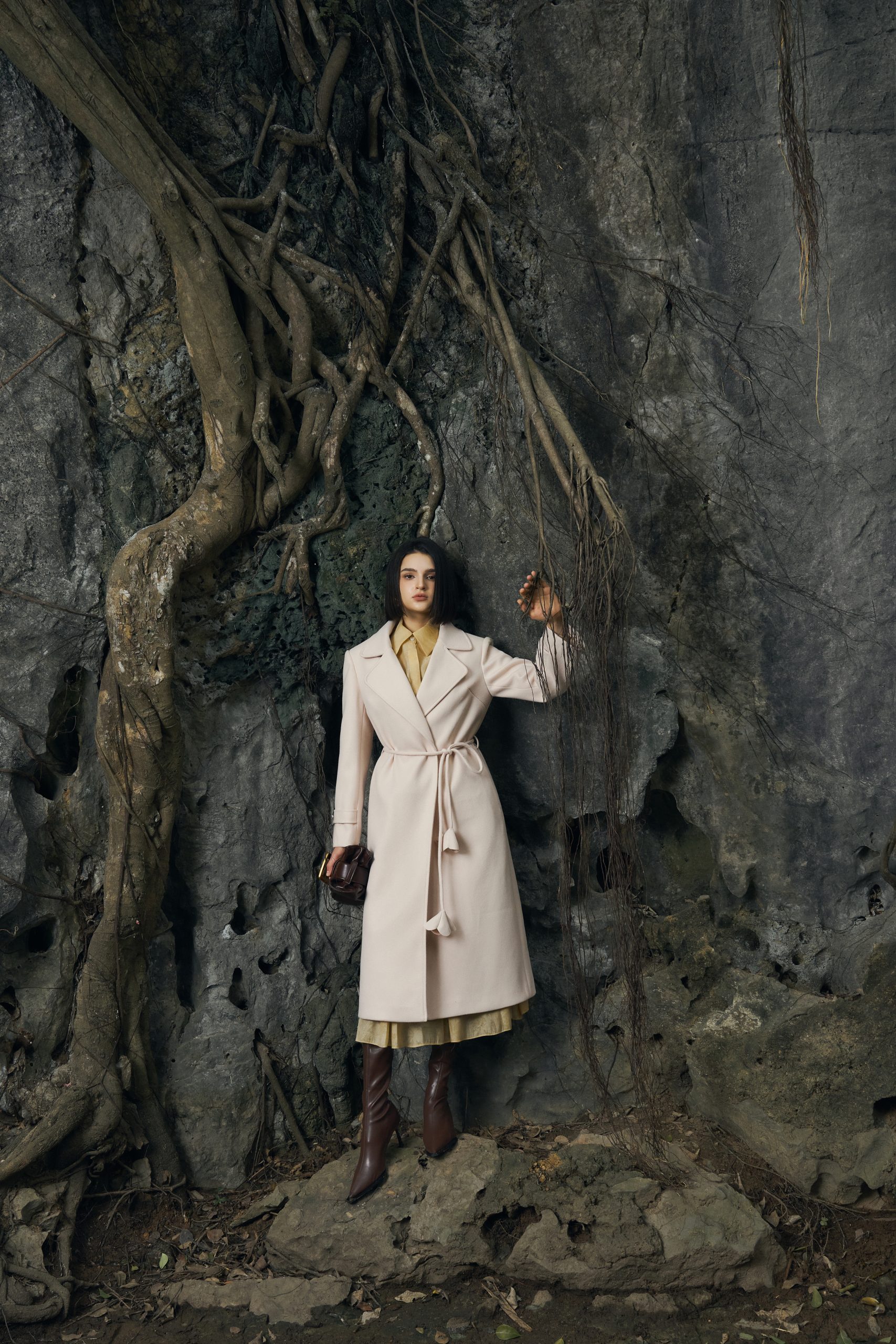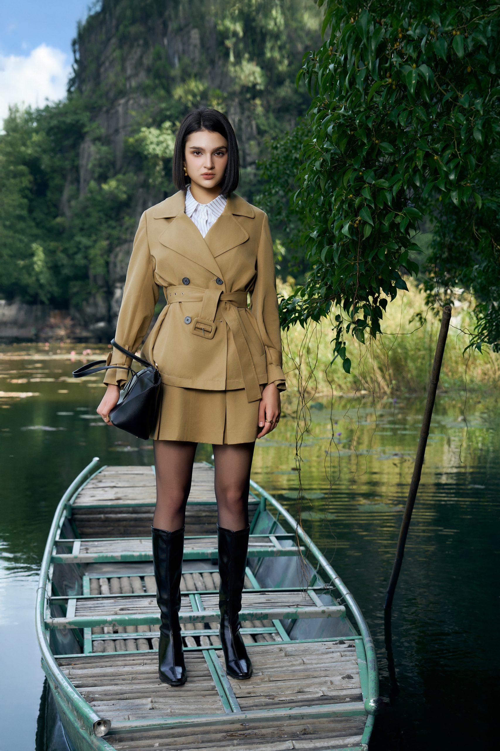 Thay vì những chiếc áo khoác quá khổ, Merne mang đến các thiết kế Cropped Jacket (áo khoác dáng lửng) và Co-ords (set bộ) với cấu trúc hiện đại. Sự bền bỉ của sợi vải Khaki tìm thấy sự đồng điệu với sự kiên cố của vách núi đá vôi. Chi tiết đai eo bản lớn giúp kiến tạo điểm nhấn vòng hai, trong khi chân váy xếp ly (Pleats) tạo không gian cho cơ thể chuyển động. Kết hợp cùng boots da bóng, tổng thể trang phục tạo nên một vẻ đẹp Sleek (mượt mà, bóng bẩy): sắc sảo và mang tinh thần tiên phong.