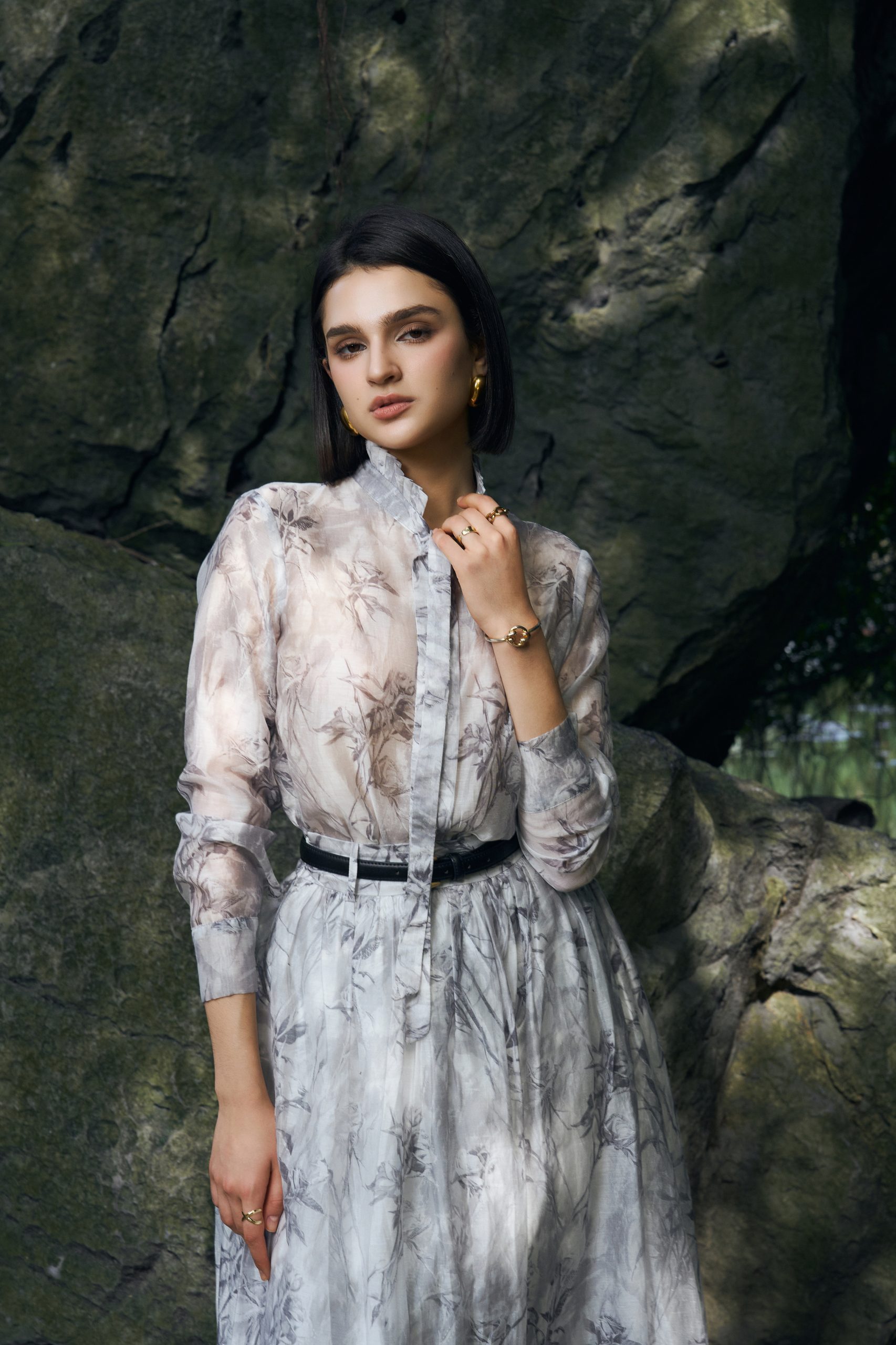 Những thiết kế sơ mi và đầm tơ với kỹ thuật dệt hoa chìm tạo nên hiệu ứng thị giác mờ ảo. Lụa nương theo gió, vuốt ve làn da, tạo ra những đường cong mềm mại đối thoại với những đường thẳng gãy gọn của thiên nhiên. Merne để chất liệu tự lên tiếng, tôn vinh vẻ đẹp tự nhiên và nội lực tiềm ẩn của người mặc. “The Heritage” khép lại bằng dư âm của cảm xúc, nơi cái đẹp hiện đại tìm thấy cội nguồn trong những giá trị bền vững.