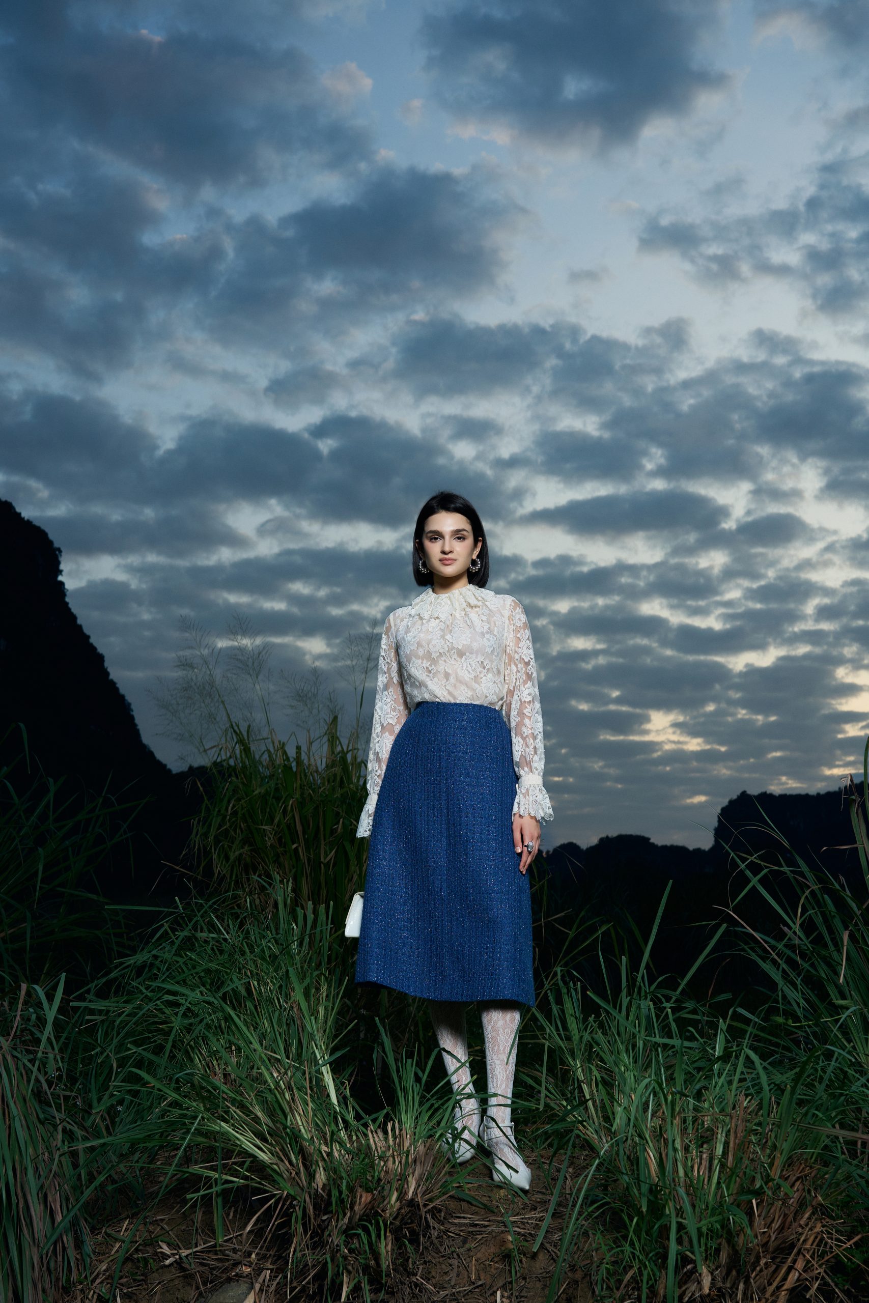 Jullia hiện diện giữa khung cảnh ấy với một trục cơ thể tĩnh tại (Static Pose), ánh mắt có chiều sâu. Ánh sáng tự nhiên khắc họa rõ nét từng thớ vải, từng đường cắt cúp trên trang phục. Sự đối lập vận hành triệt để: giữa sự hùng vĩ bao la của đất trời và sự tỉ mỉ (Craftsmanship) của đường kim mũi chỉ. Merne đặt người phụ nữ vào trung tâm, khẳng định vị thế chủ thể đầy tự chủ. Bức tranh tổng thể gợi lên cảm giác vừa vững chãi, vừa đầy chất thơ, nơi “Di Sản” được kể lại bằng ngôn ngữ của cái đẹp vĩnh cửu.