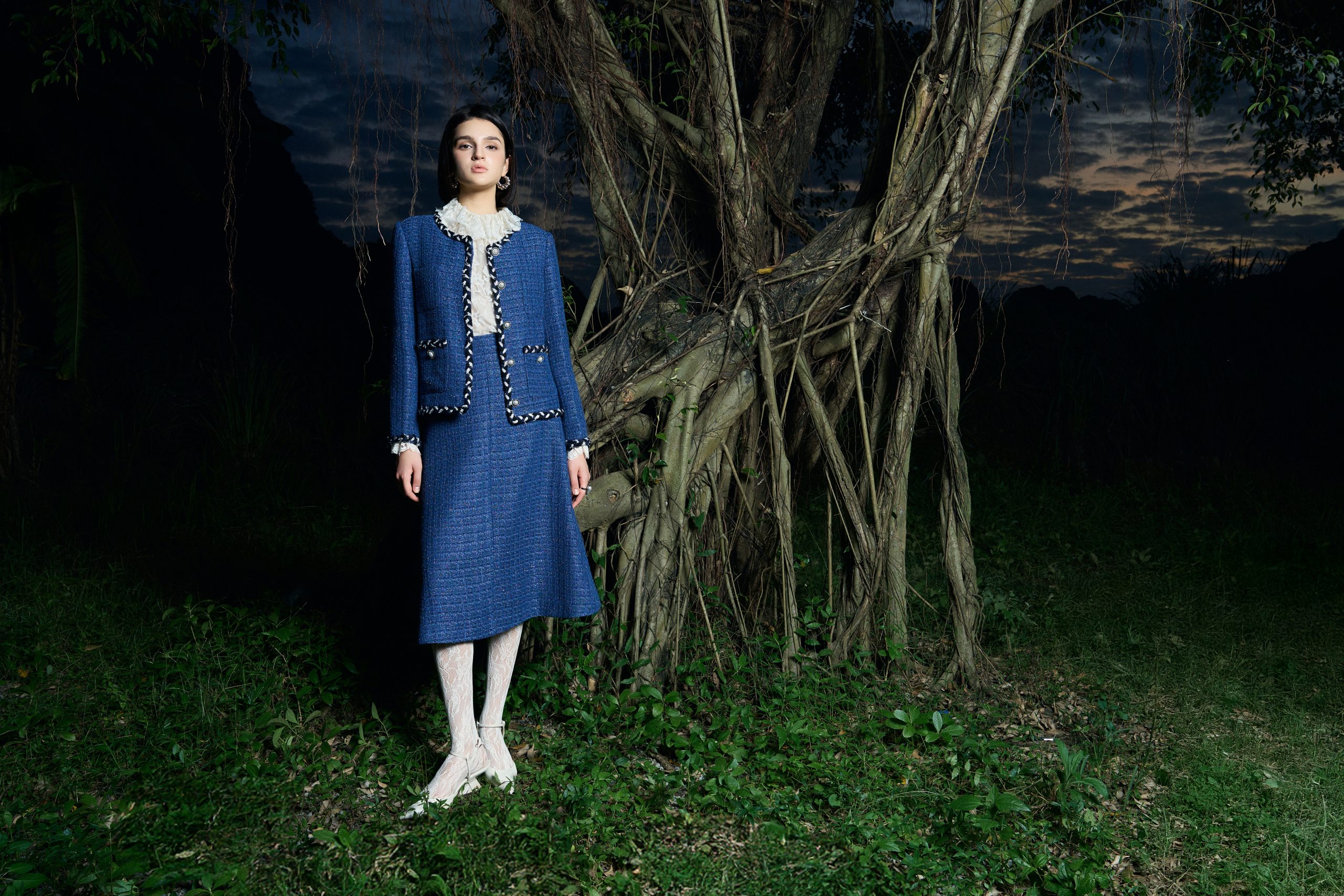 Chất liệu Tweed dệt kim tuyến bắt sáng và Dạ Tuytsy đanh mịn mang lại bề mặt vật liệu giàu chiều sâu. Đặt cạnh sự rêu phong của vách núi, sự mượt mà và trật tự của Tweed càng trở nên nổi bật. Neutral Palette (bảng màu trung tính) gồm trắng kem và xanh navy được sử dụng triệt để nhằm duy trì sự thanh lịch tối thượng (Ultimate Elegance). Trang phục lúc này trở thành lớp vỏ bọc hoàn hảo, định hình phong thái của một quý cô: lạnh lùng bên ngoài, rực rỡ bên trong.
