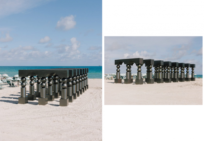 Drawing from a stylistic lexicon that blends postmodernism with ancient Egyptian and Greek architecture, Zeta’s “The Observer Effect” consists of eight large-scale portals, each measuring 14 by 16 feet. These structures are not mere objects; they are a rhythmic “field of portals” that guide visitors through evolving sightlines of columns, arches, and spheres. Zeta describes the work as a “ritual passageway,” an intentional pause between the frenetic energy of the art fairs and the vast, meditative expanse of the Atlantic Ocean.