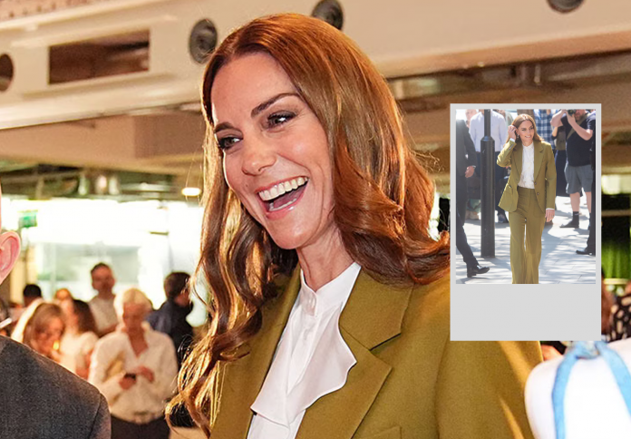 At the British Fashion Council event, Kate Middleton turned heads not only as a royal representative but as a style icon reclaiming the public stage. She wore a chic olive green suit—flared pants paired with a sharp blazer featuring side pockets and resin-toned buttons. The outfit was elevated with tan pointed heels and a white blouse delicately adorned with frill detailing, making it one of her boldest and most fashion-forward statements in recent memory.
