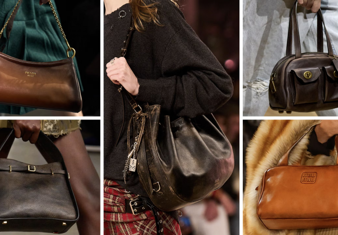 The distressed handbag trend solidified its status during the Fall/Winter 2025 runway circuit, where it acted as a unifying theme across a variety of design philosophies. The aesthetic is characterized by leather that is intentionally faded, wrinkled, washed, or slightly scuffed to create a vintage or “loved” appearance from day one.