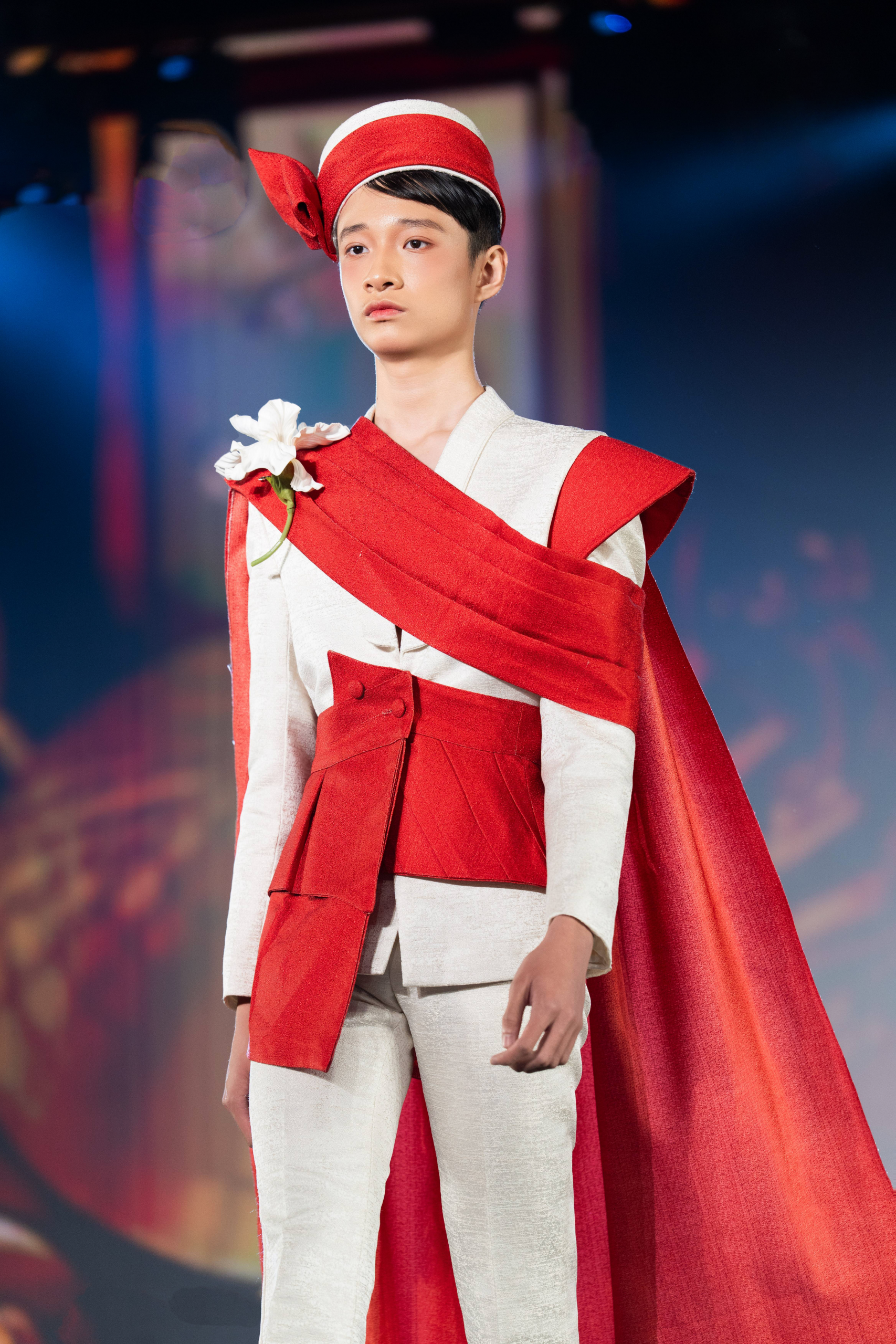 Trình diễn thiết kế kết hợp giữa suit hiện đại và tà choàng đỏ dài, Nguyễn Bá Thiện Minh cho thấy khả năng kiểm soát hình thể ổn định. Với chiều cao 1m71, Minh duy trì nhịp điệu catwalk khoan thai, tập trung giữ sự cân bằng cho bộ trang phục khi di chuyển trên quãng đường dài của sàn runway. Từng sải bước dứt khoát giúp phom dáng bộ đồ luôn ở trạng thái chỉn chu nhất trước ống kính truyền thông.